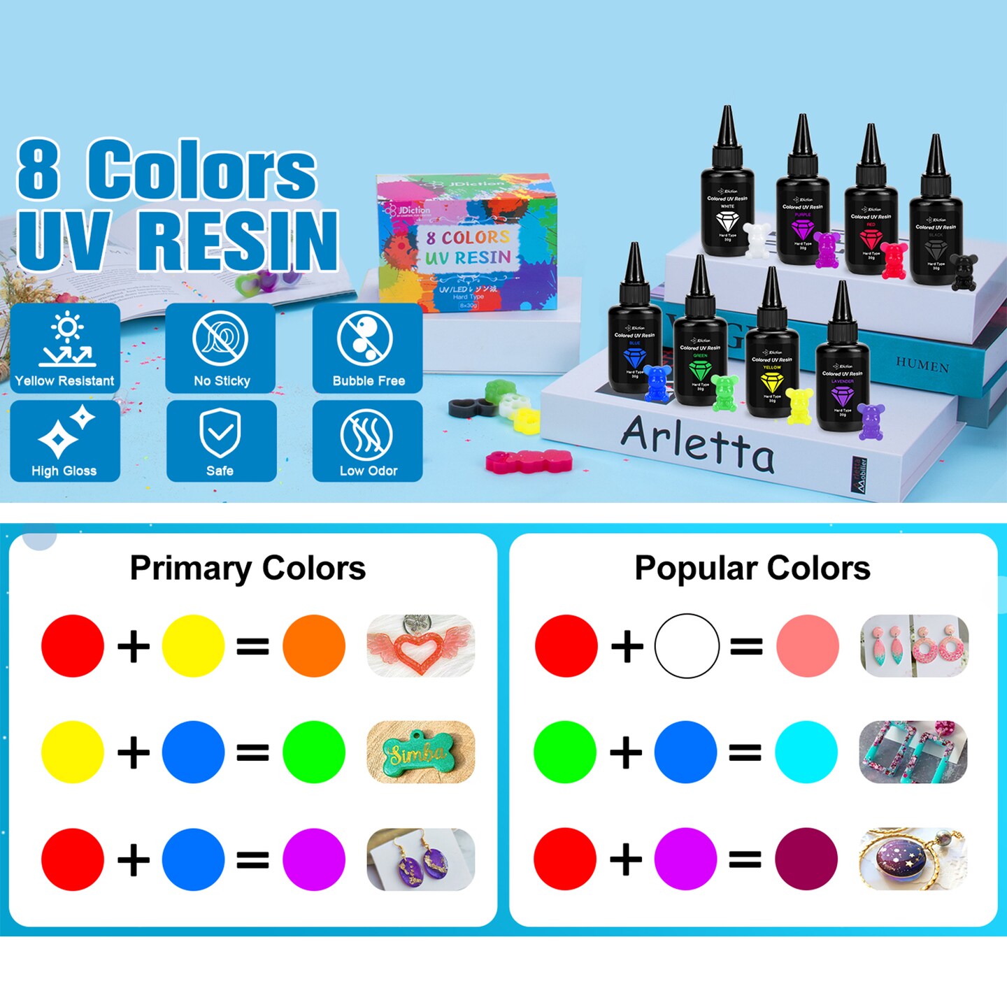 JDiction UV Resin, 8 Colors-240g UV Resin Odorless and Hard Rainbow UV Resin Kit for Jewelry Making, Colored Resin Casting and Coating, Crafts and Decoration