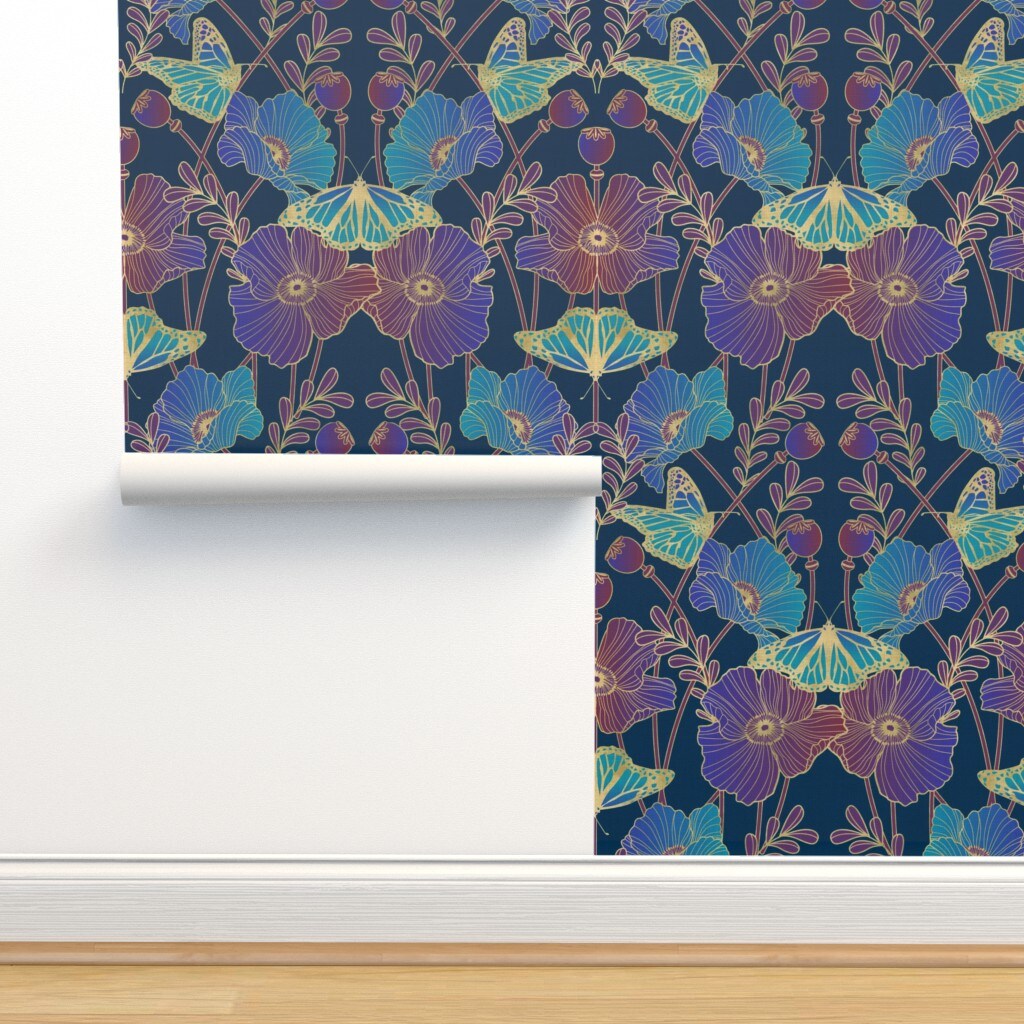 Jewel Tone Poppies Art Nouveau Poppy And Butterfly Blue Aqua Purple Large Scale Floral Custom Removable Wallpaper by Spoonflower Peel & Stick Wallpaper 2FT Wide