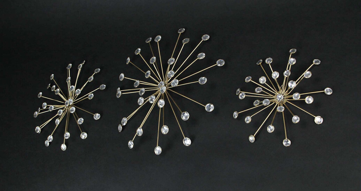 Jeweled Metal Sunburst Wall Mounted Hanging Sculpture Set of 3
