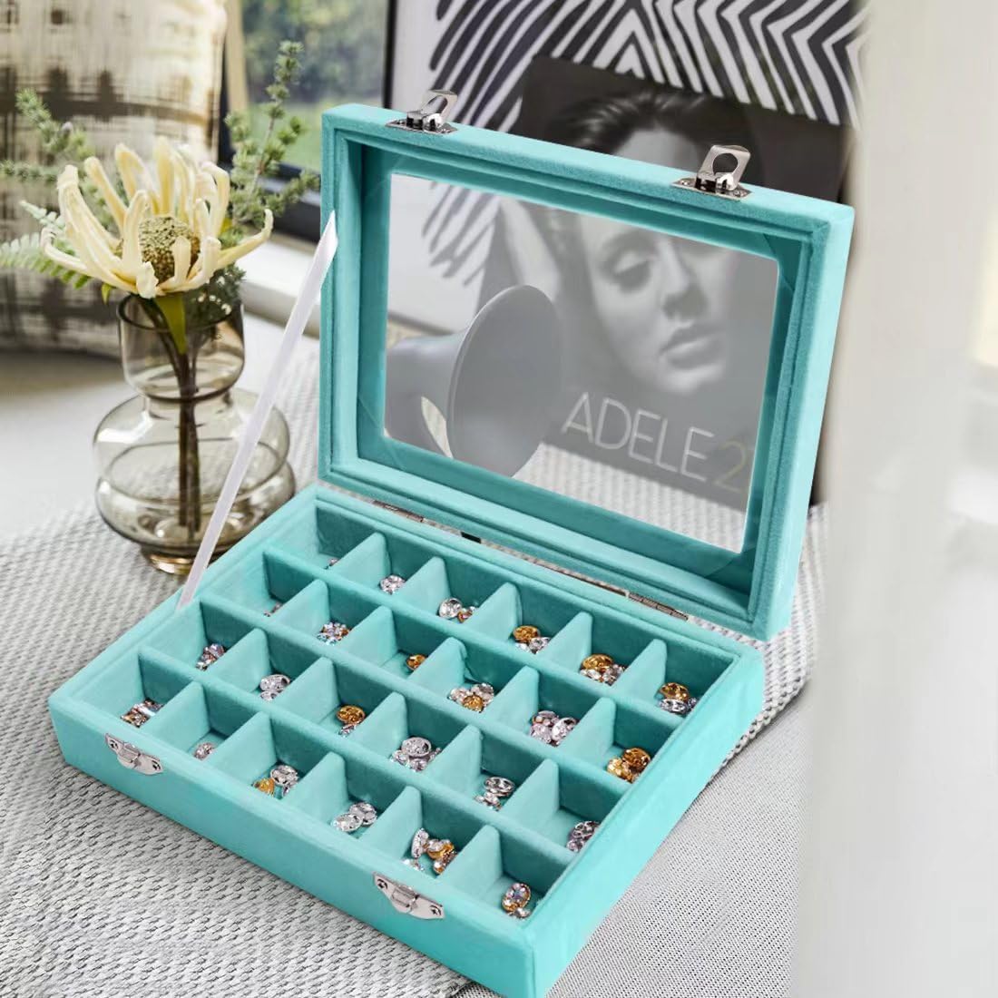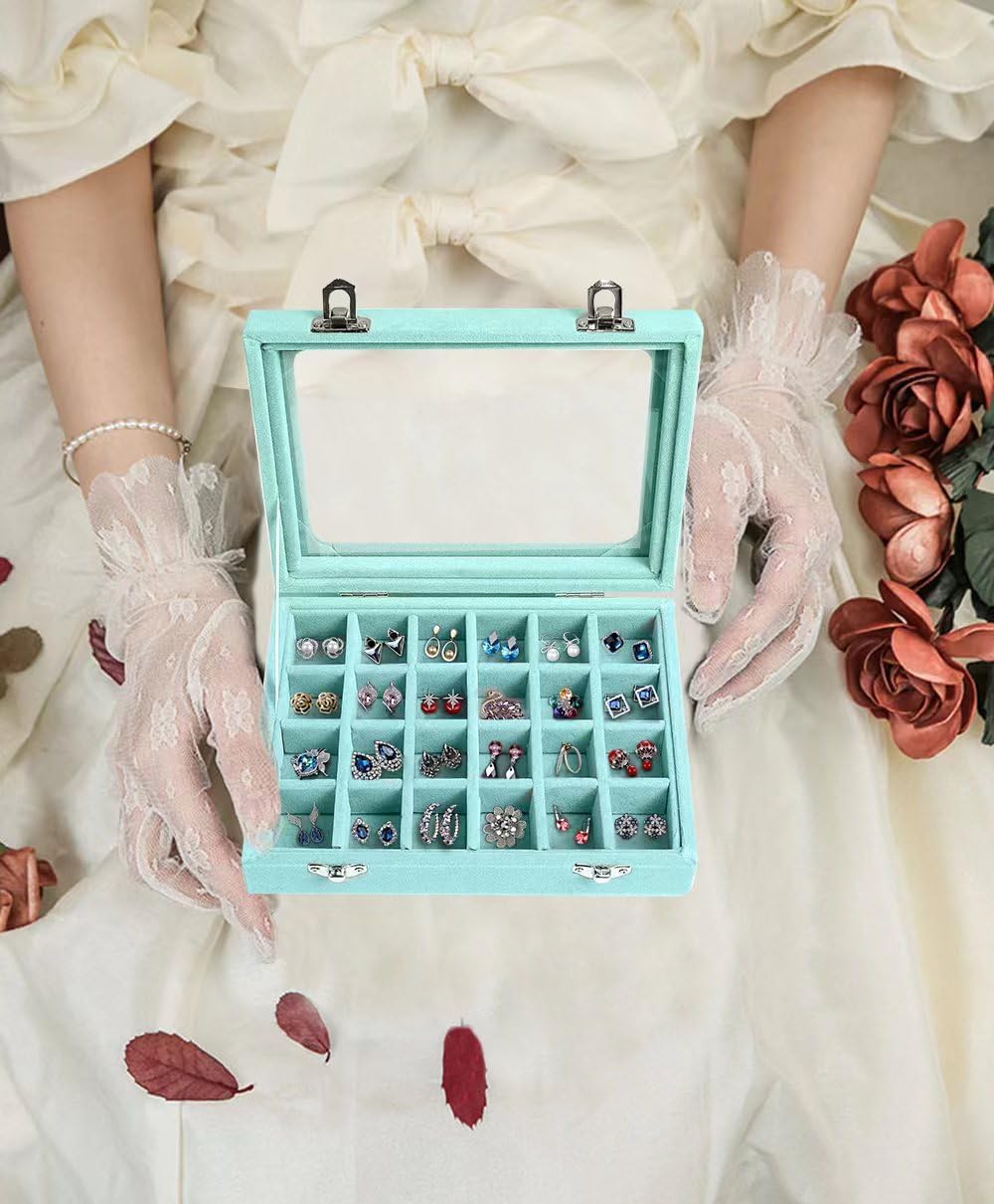 Jewelry Box 24-Grid Velvet Earring Holder Tray – Detachable Jewelry Organizer with Clear Glass Lid for Rings, Earrings, Necklaces, Bracelets – Light Blue (Light blue)