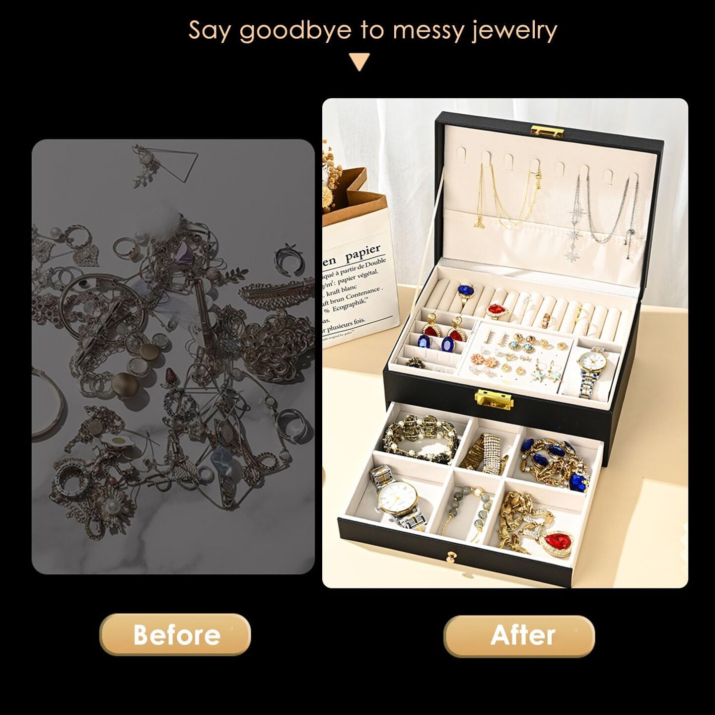Jewelry Box for Women, Girls, and Wives – Large PU Leather Jewelry Organizer with Two Layers, Storage Case for Earrings, Bracelets, Rings, and Watches (Black)