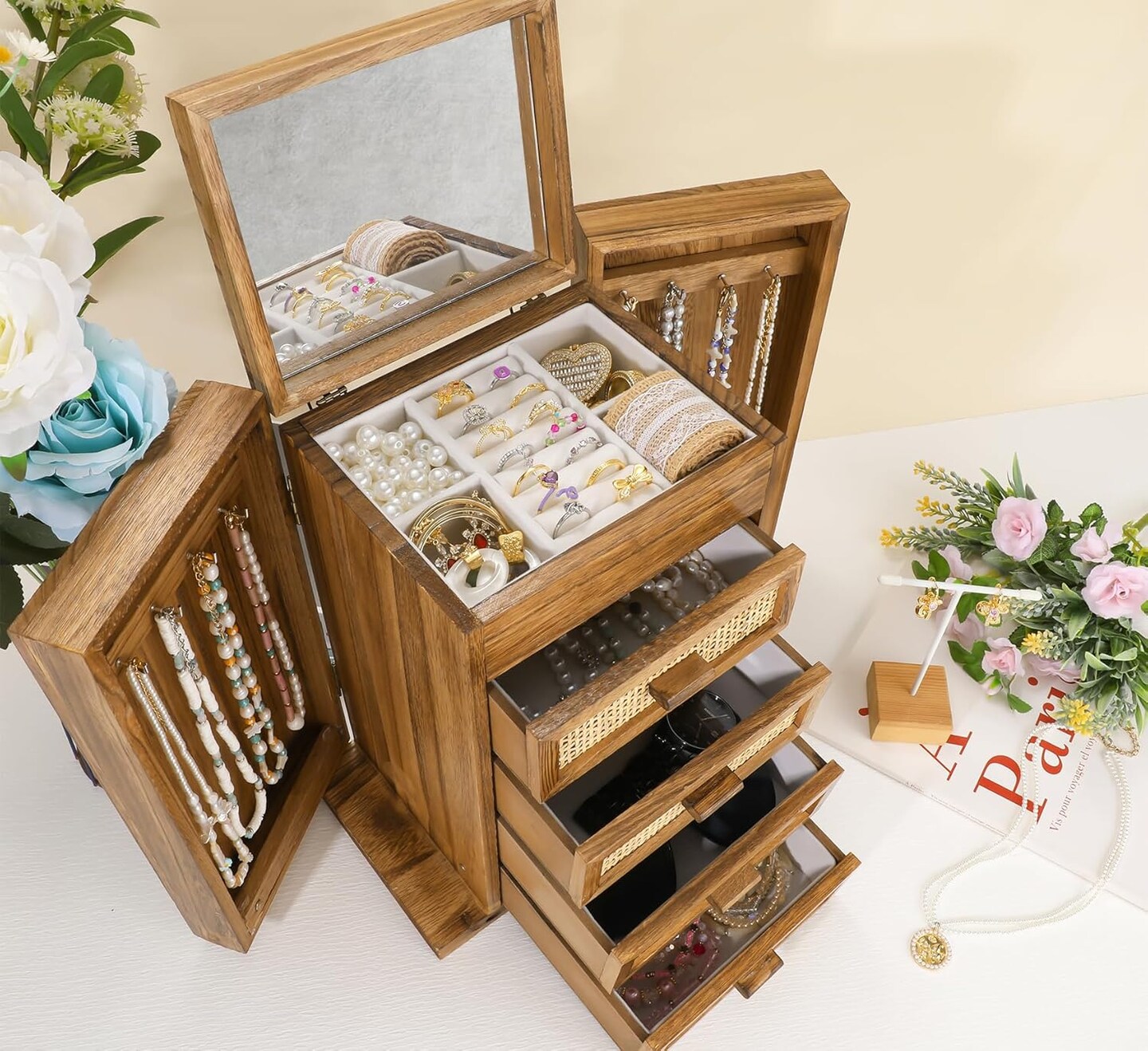Jewelry Organizer, Rattan Jewelry Box, 5 Layer Wooden Jewelry Organizer Box with Mirror, Jewelry Boxes with 4 Drawers for Women Men, Jewelry Storage for Rings Earrings Necklaces Bracelets Watch