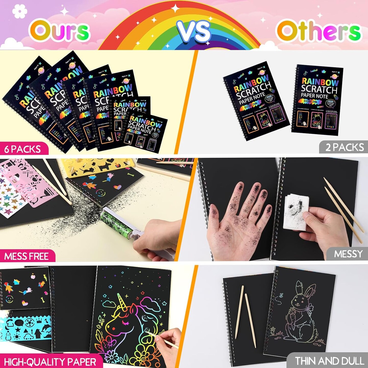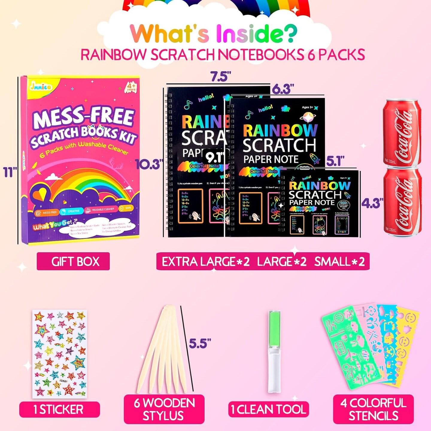 JMMICO Rainbow Scratch Notebook, Scratch Art for Kids with Reusable Cleaner Tool, Holiday Crafts for Kids, Art Supplies, Christmas Gifts for 4-9 Year Old Kids