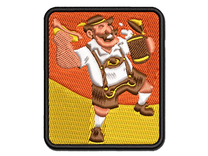 Jolly Bavarian Man in Lederhosen with Beer Stein and Sausage Multi-Color Embroidered Iron-On or Hook & Loop Patch Applique