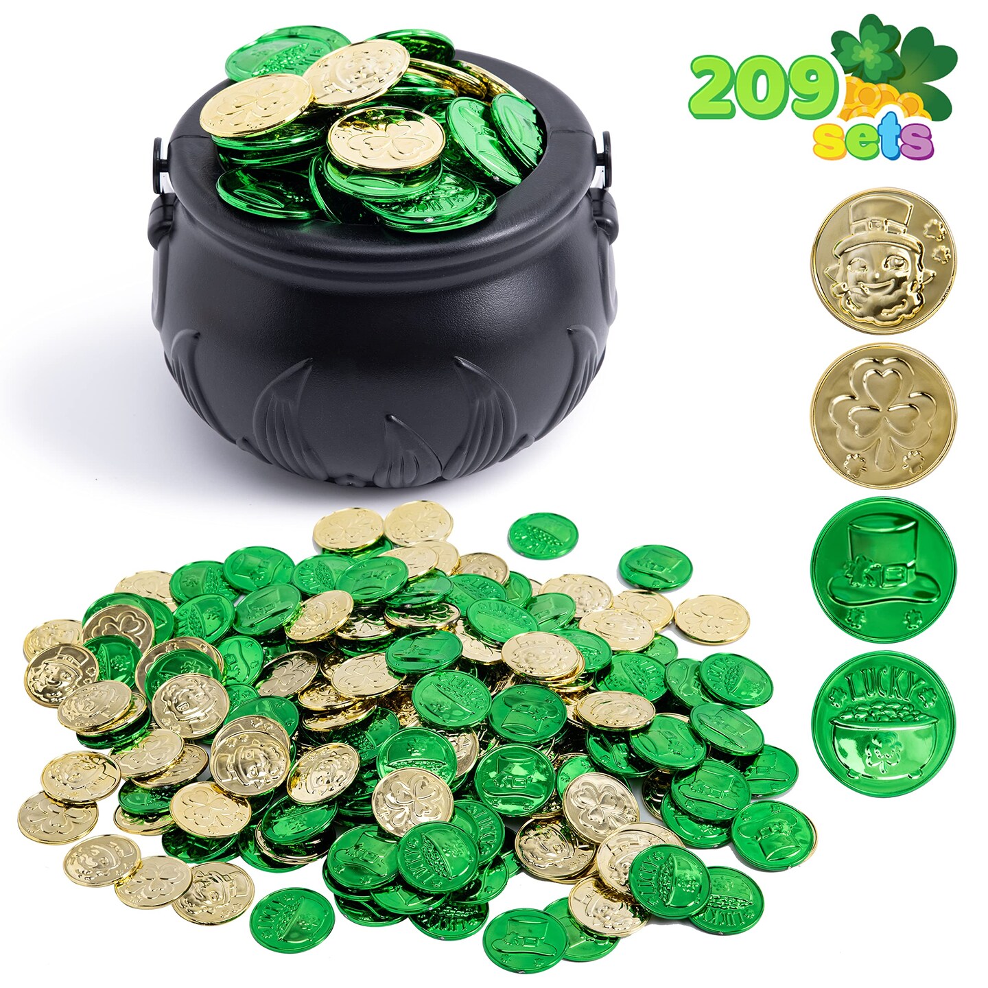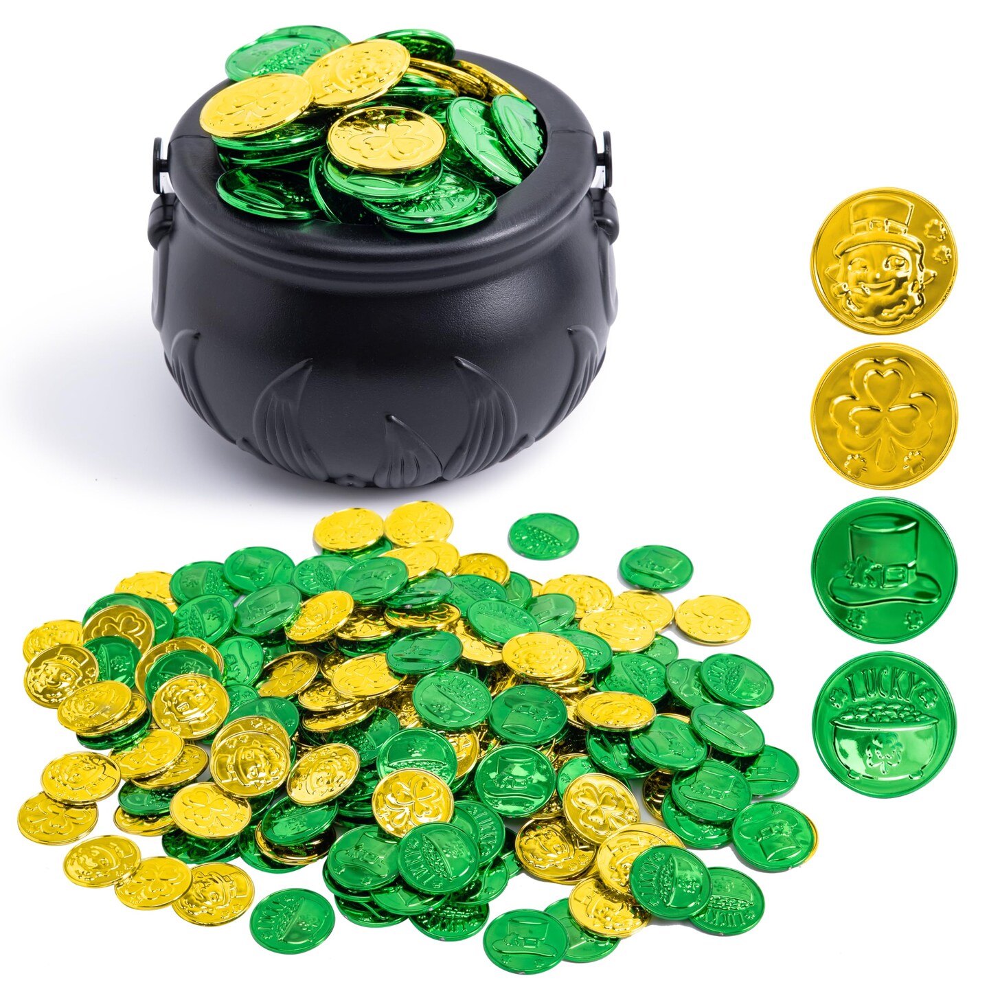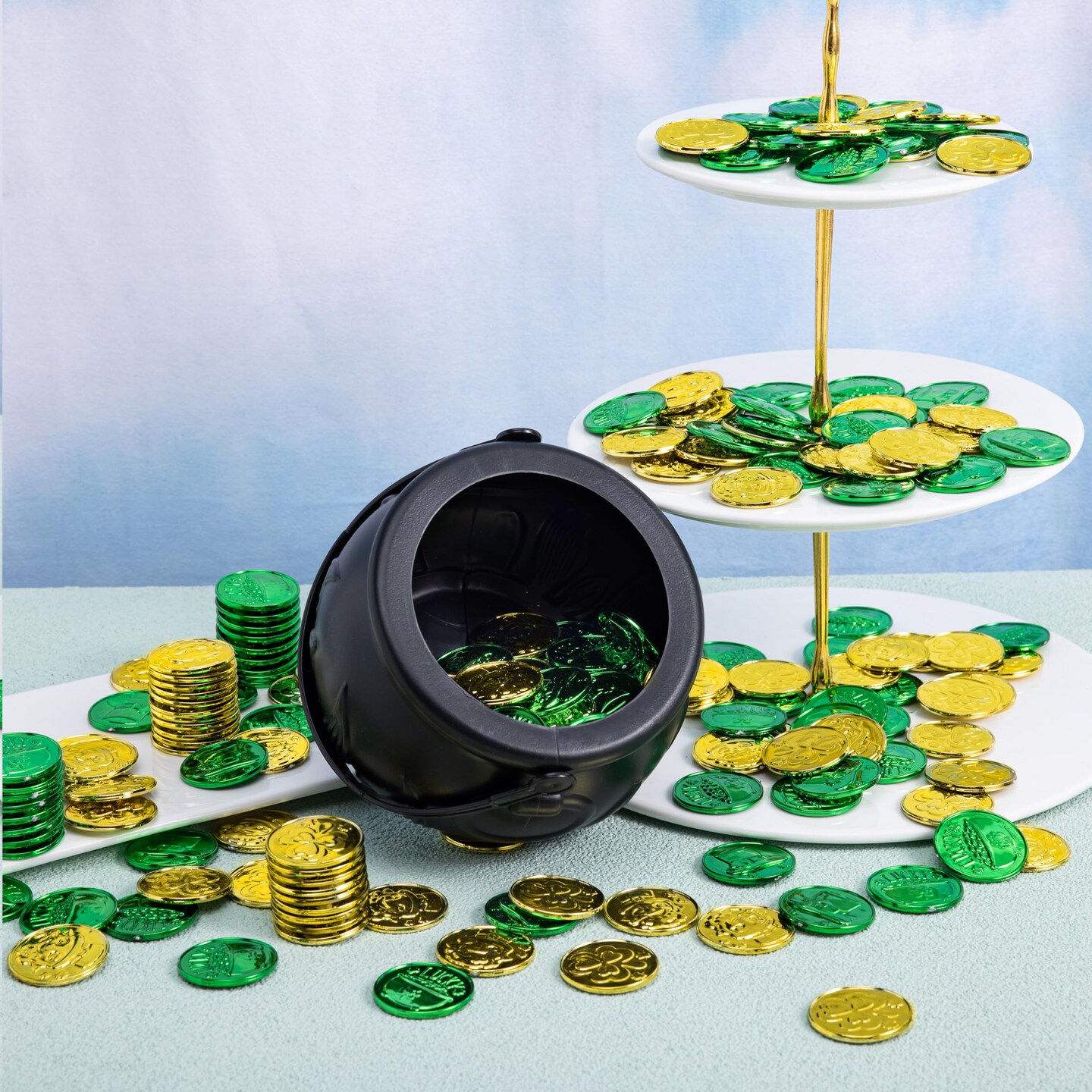 JOYIN 208 St Patrick’s Day Lucky Leprechaun Plastic Coins and 1 Large Black Cauldron with Handle Pot of Gold Party Supplies, St Patrick Decorations Party Favors