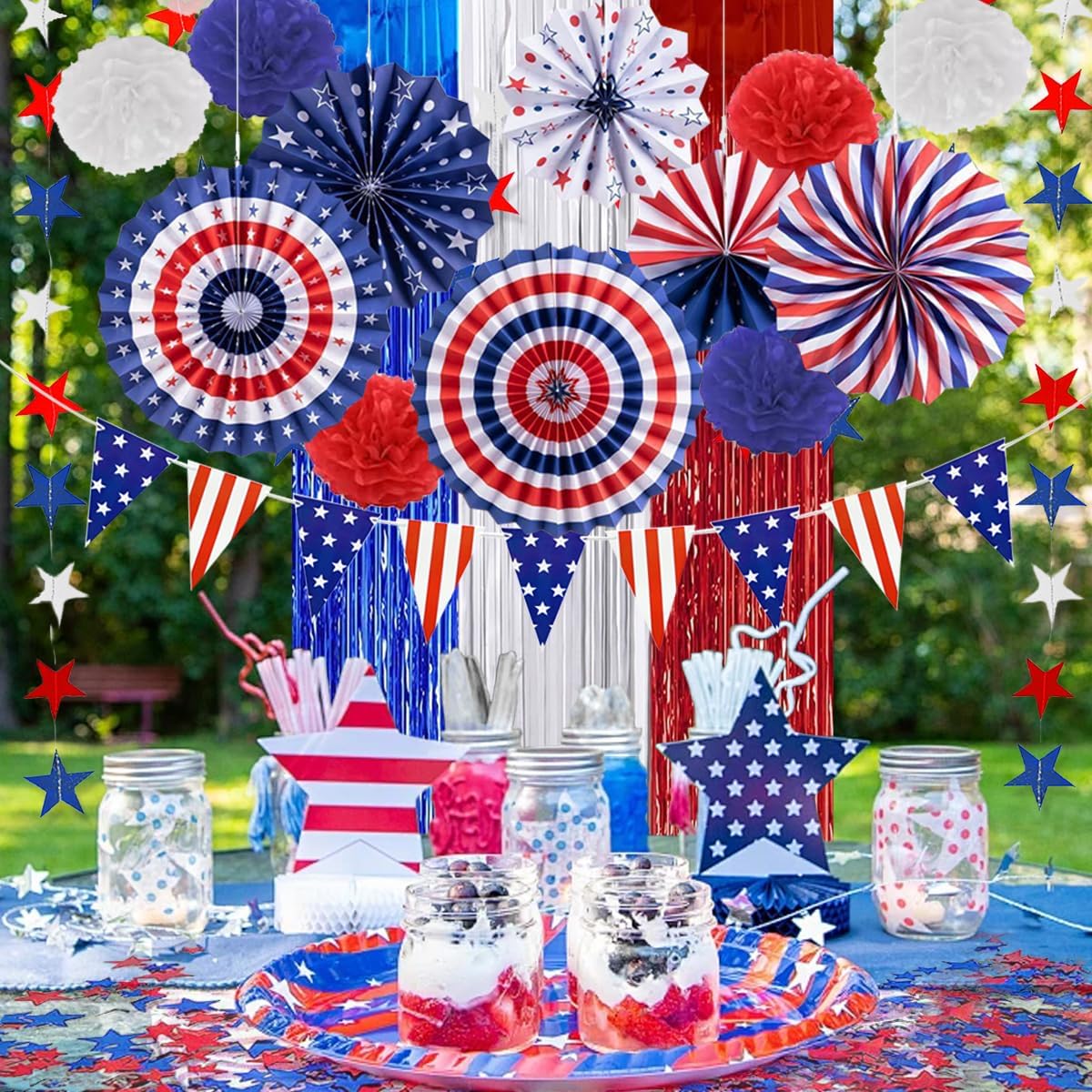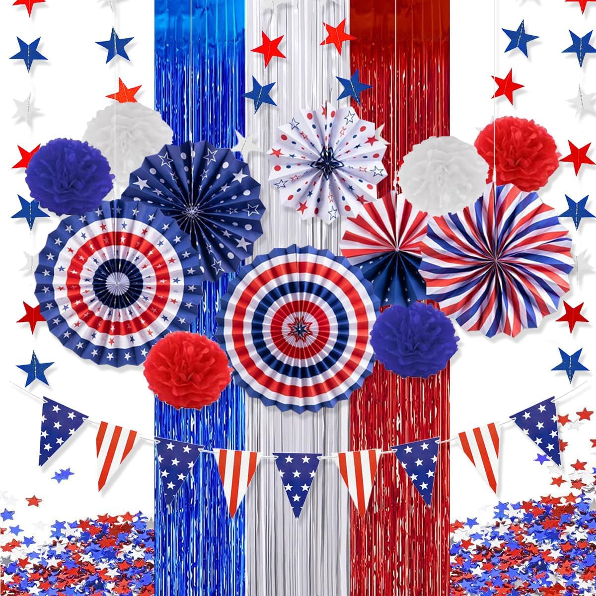 July 4th Patriotic Party Decoration Set, Fourth of July Red White Blue Paper Fans, USA American Flag Pennant, PomPomPoms Flower, Foil Tassel Curtains, Star Ribbon, Independence Day Party Supplies