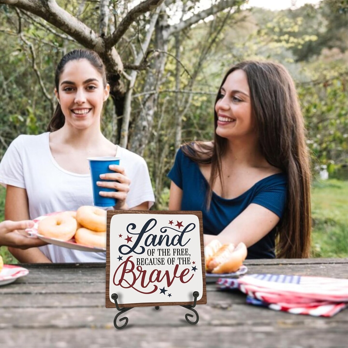 July 4th Wooden Plaque With Iron Stand - Free & Brave - 4"X4" Wood Sign For Memorial Day, America Patriotic Tabletop Signs, Shelf, Desk Decorations, Party Supplies - 07