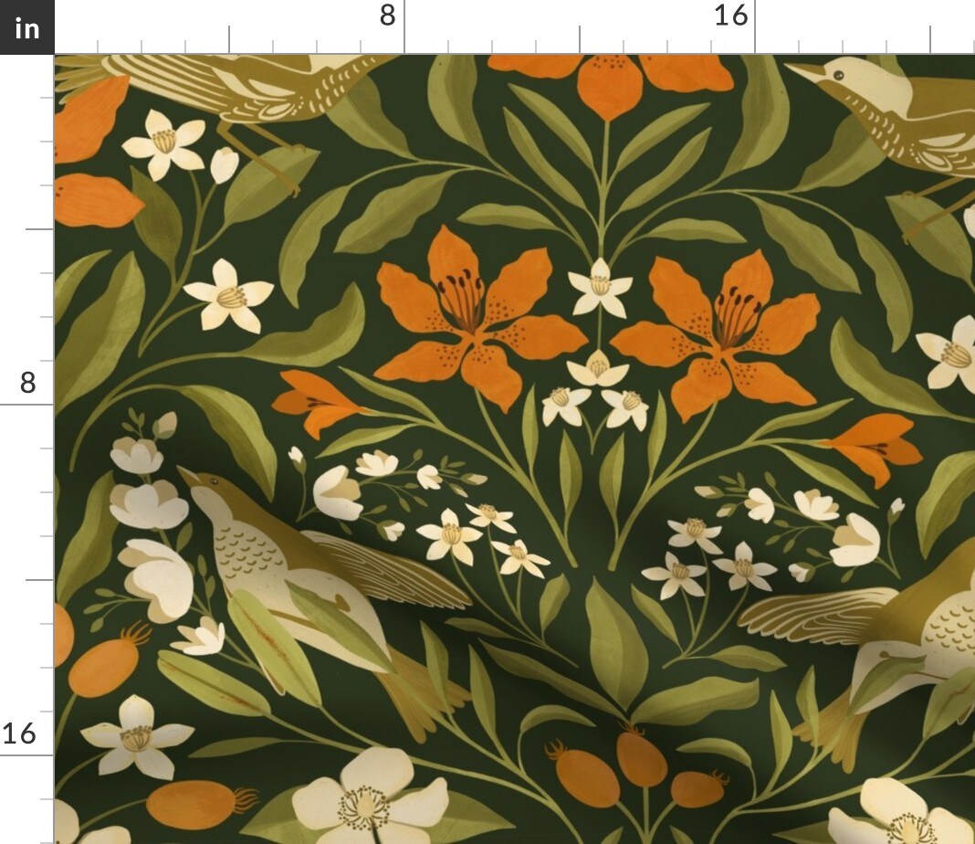 Jumbo Floral Green Leaves Orange Lily Flowers Birds Custom Printed Fabric by Spoonflower Various Fabrics by the Yard or Fat Quarter