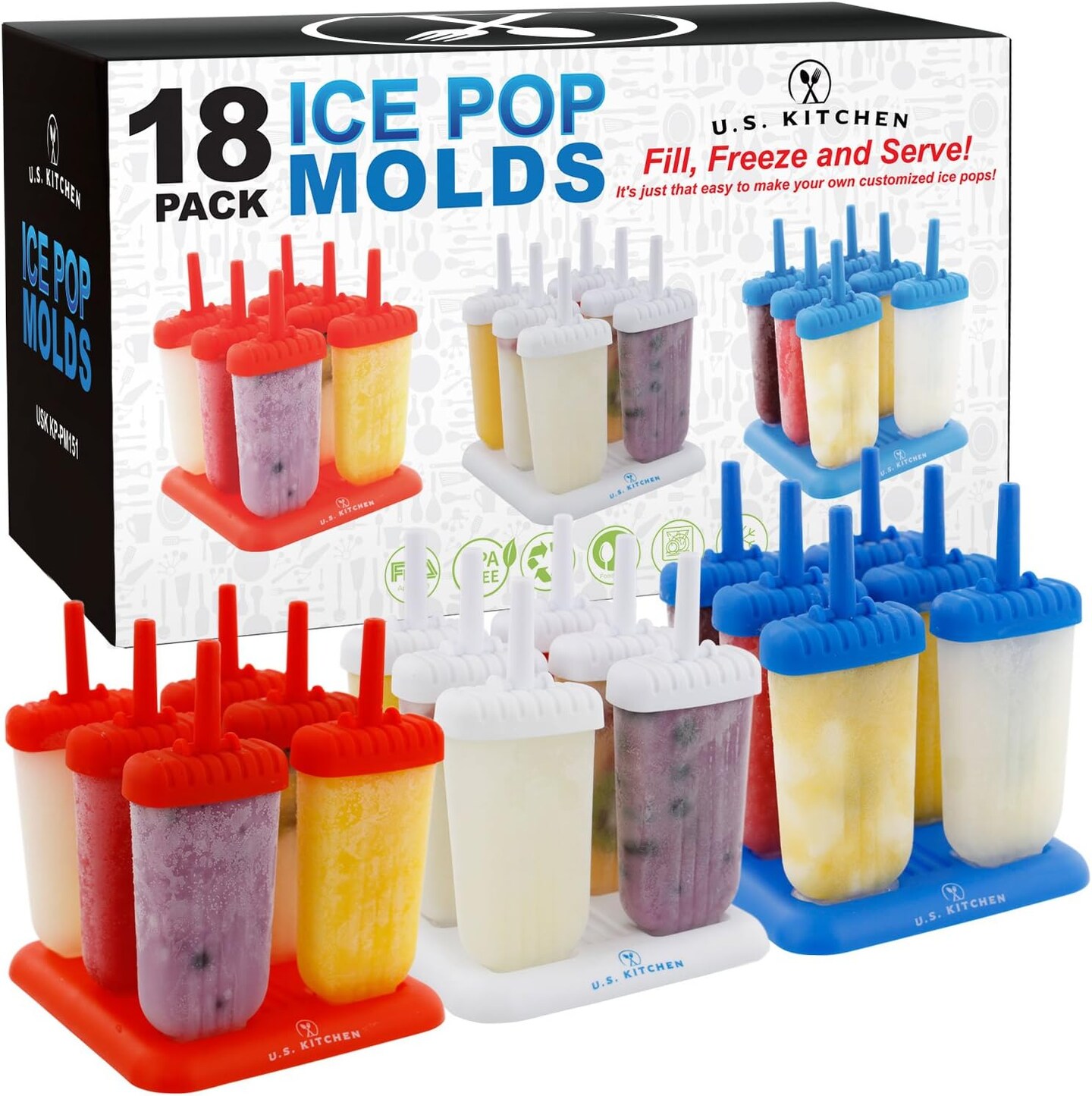 Jumbo Set of 18 Classic Ice Pop Popsicle Molds - Sets of 6 Red, 6 White & 6 Blue - Reusable USA Colored Ice Pop Makers