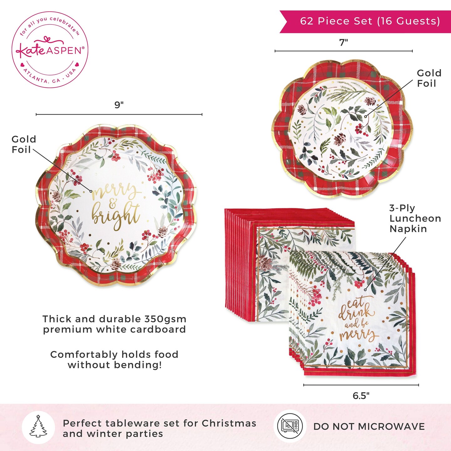 Kate Aspen Christmas Tableware Set - 7” Plate (set of 16), 9” Plate (set of 16), and Napkin (set of 30)