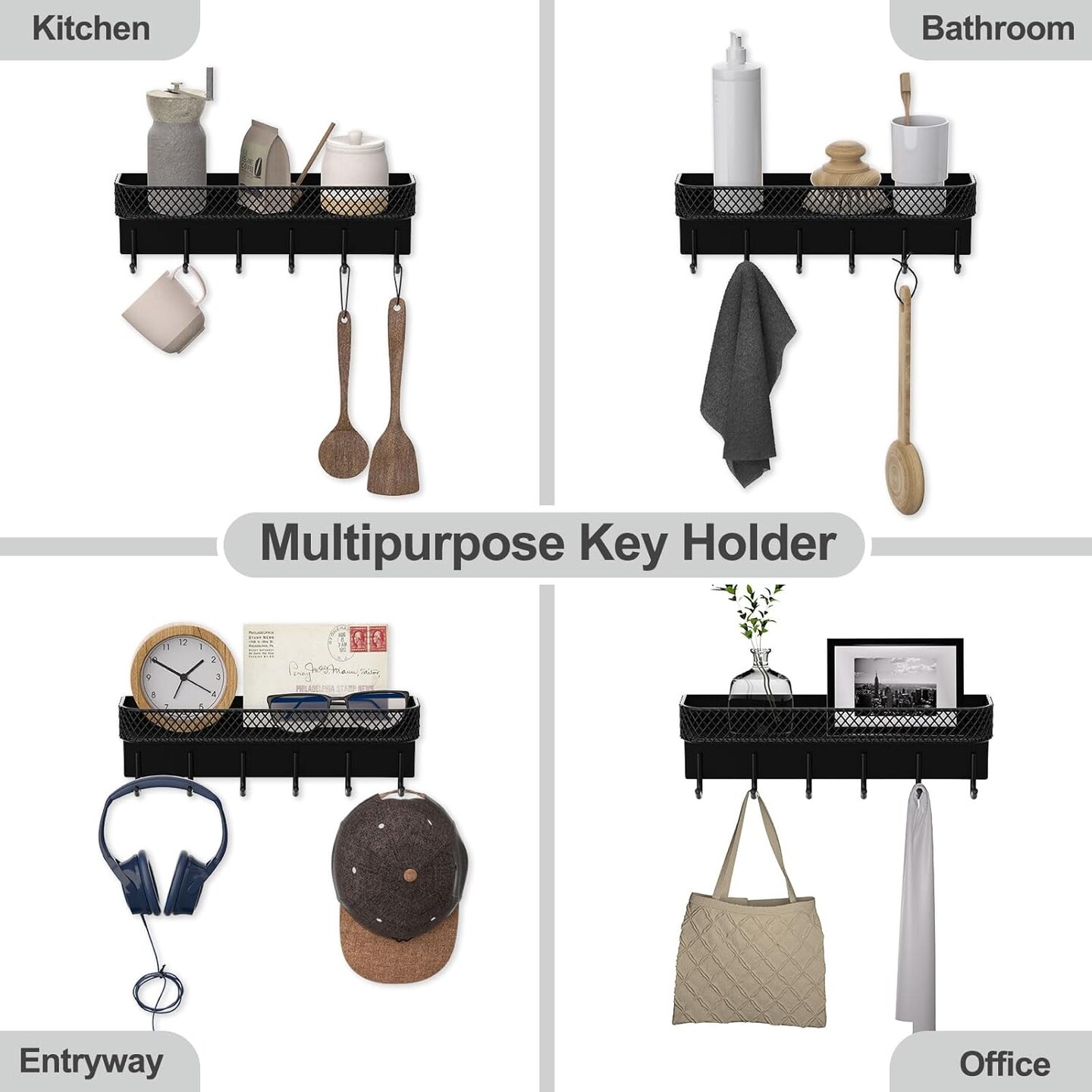 Key Holder for Wall – Decorative Stainless Steel Key Hanger with 6 Hooks for Hats, Bags, Leashes – Mail Holder Key Rack with Mounting Hardware and Guide (9.65” x 2.8” x 2.2”) (Black)