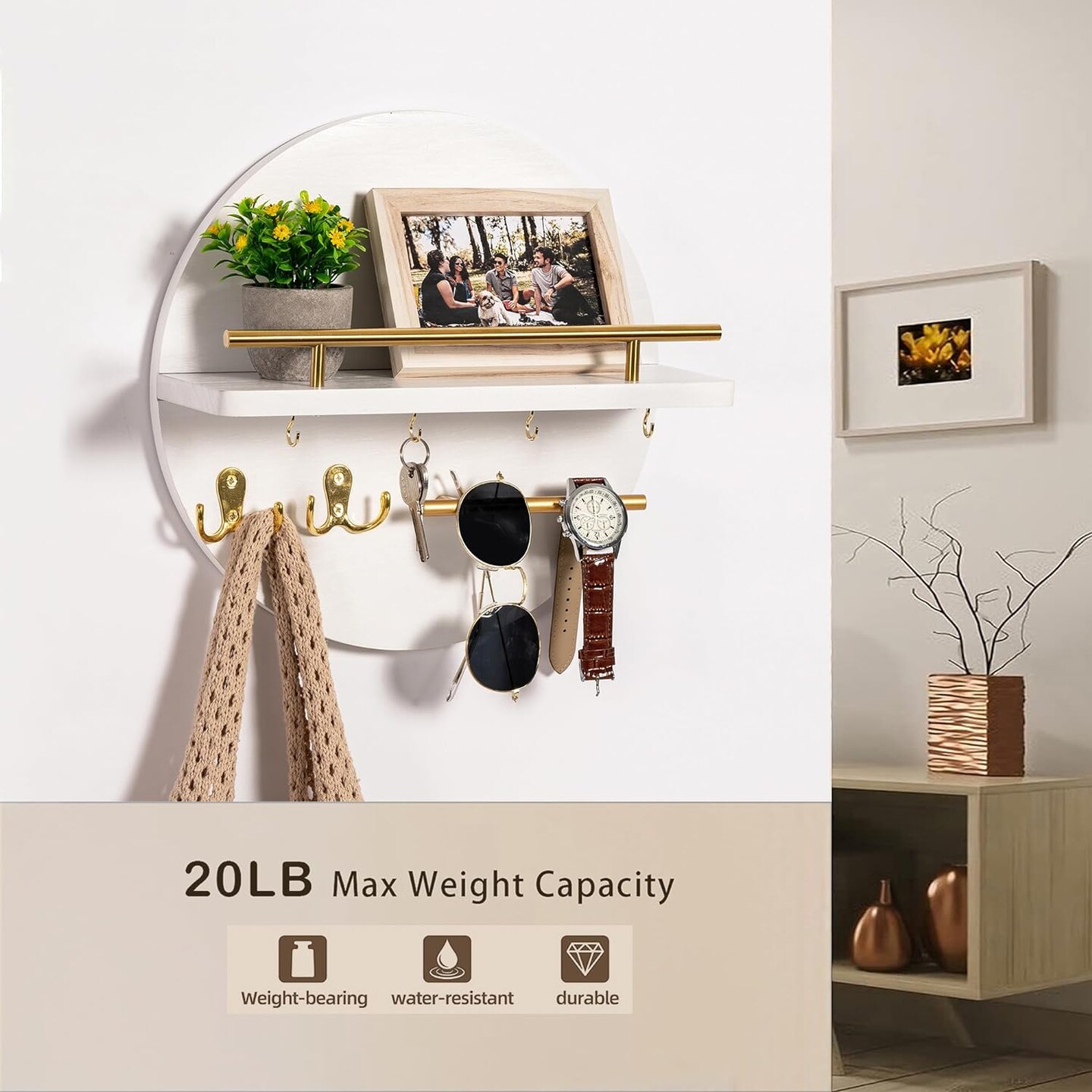 Key Holder for Wall Decorative with Shelf and Hooks, Mail Organizer Wall Mount with Sunglasses Holder, Circular Design Entryway Key Rack Hanger, Rustic Home Decor Boho Wall Decor (White)