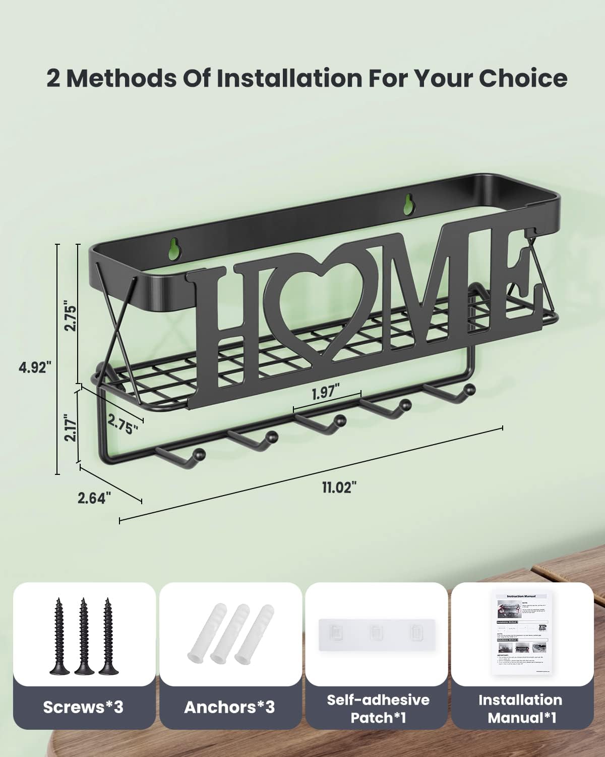 Key Holder for Wall - Key Rack with 5 Key Hooks, 11.02" L×2.75" W×4.92" H, Key and Mail Organizer Wall Mount with Mesh Basket, Key Hanger for Wall, Entryway, Home Decor(Matte Black)