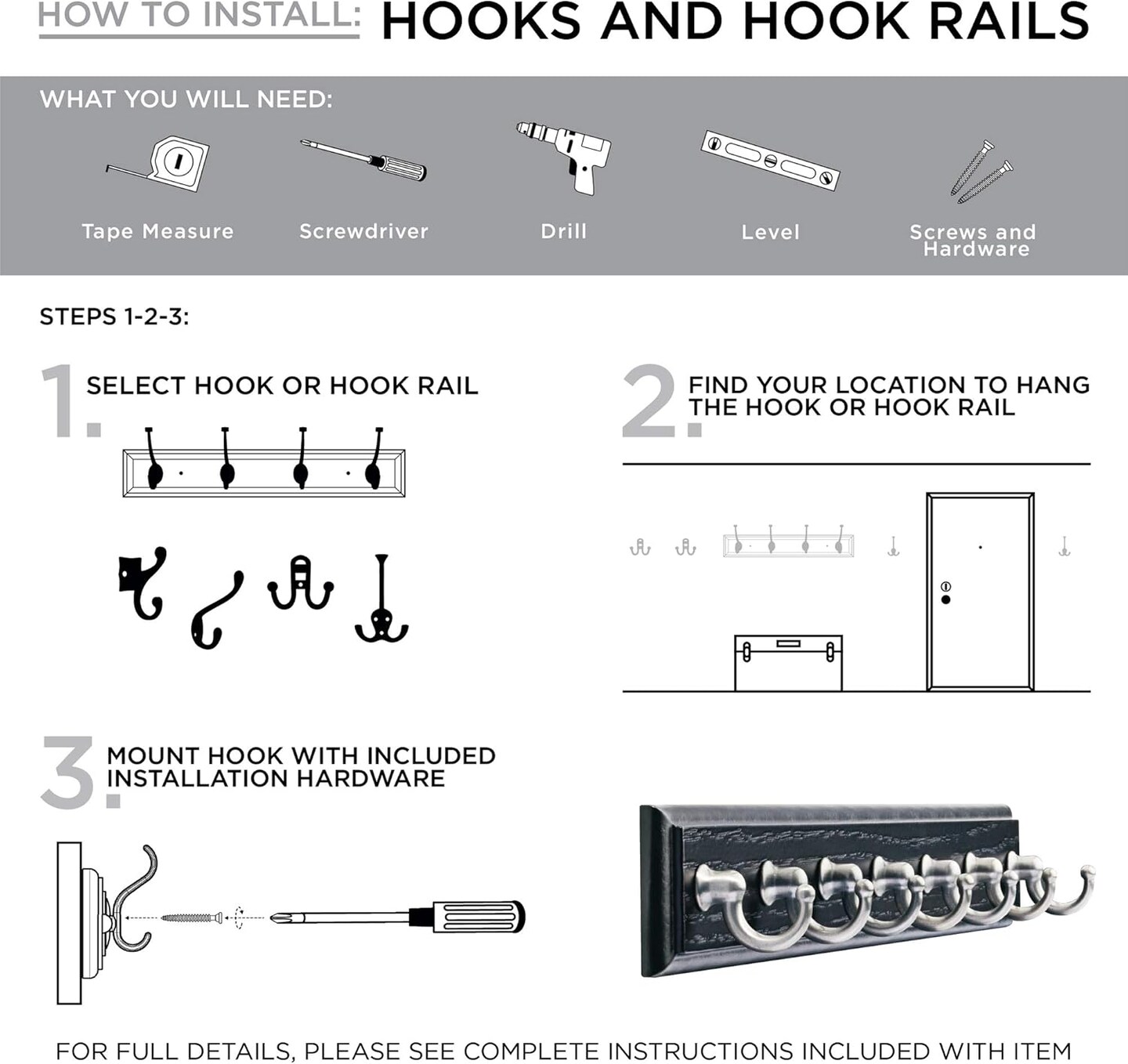 Key Tidy (1-Pack) Black Key Holder 14" Wall Mount Key Rack 7 Key Hooks for Wall, Hallway, Entry Small Keychain Rail Organizer FBKEYT7-BSE-R