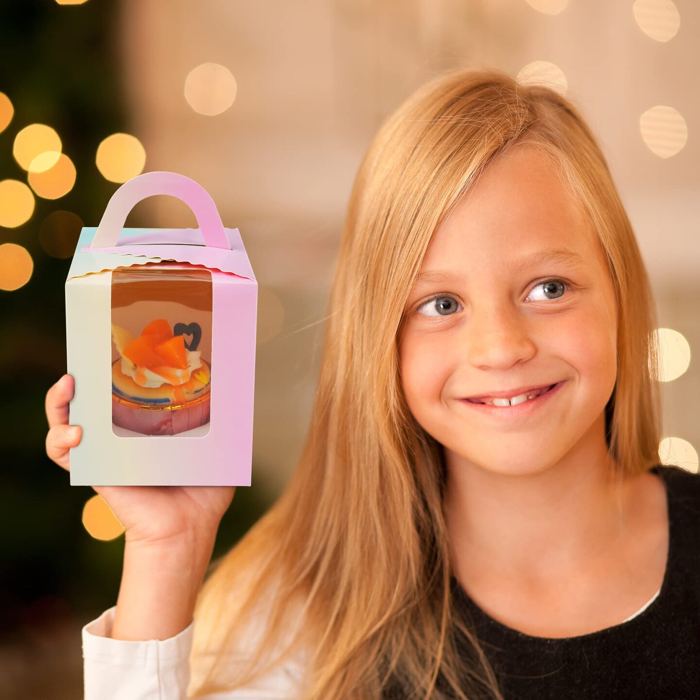 KEYIDO 30 Pcs Individual Cupcake Boxes Gradient Single Cupcake Boxes 1 Hole Cake Box with Clear Window Inserts and 2 Sheets of Stickers for Wedding Birthday Party Favors