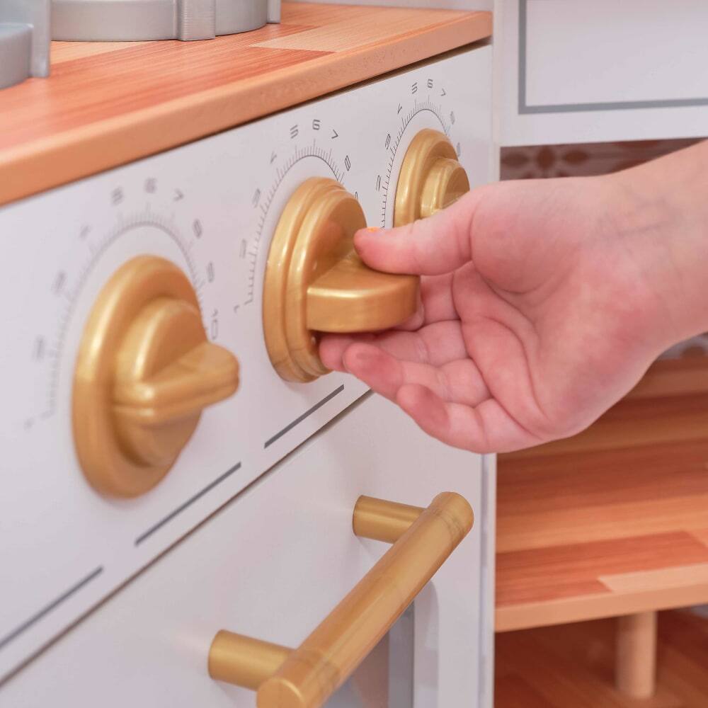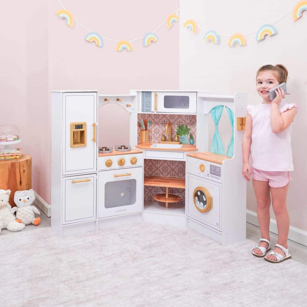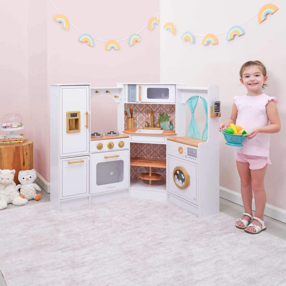 KidKraft White Wooden Ultimate Corner Wooden Play Kitchen Set with Lights & Sounds
