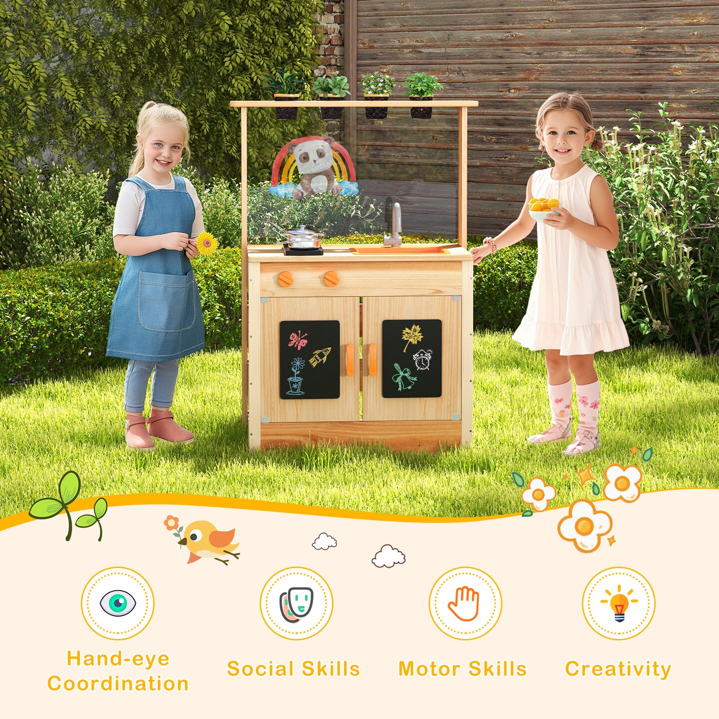 Kids Mud Kitchen Fir Wood Playset with Planting Pots and Blackboards-Natural