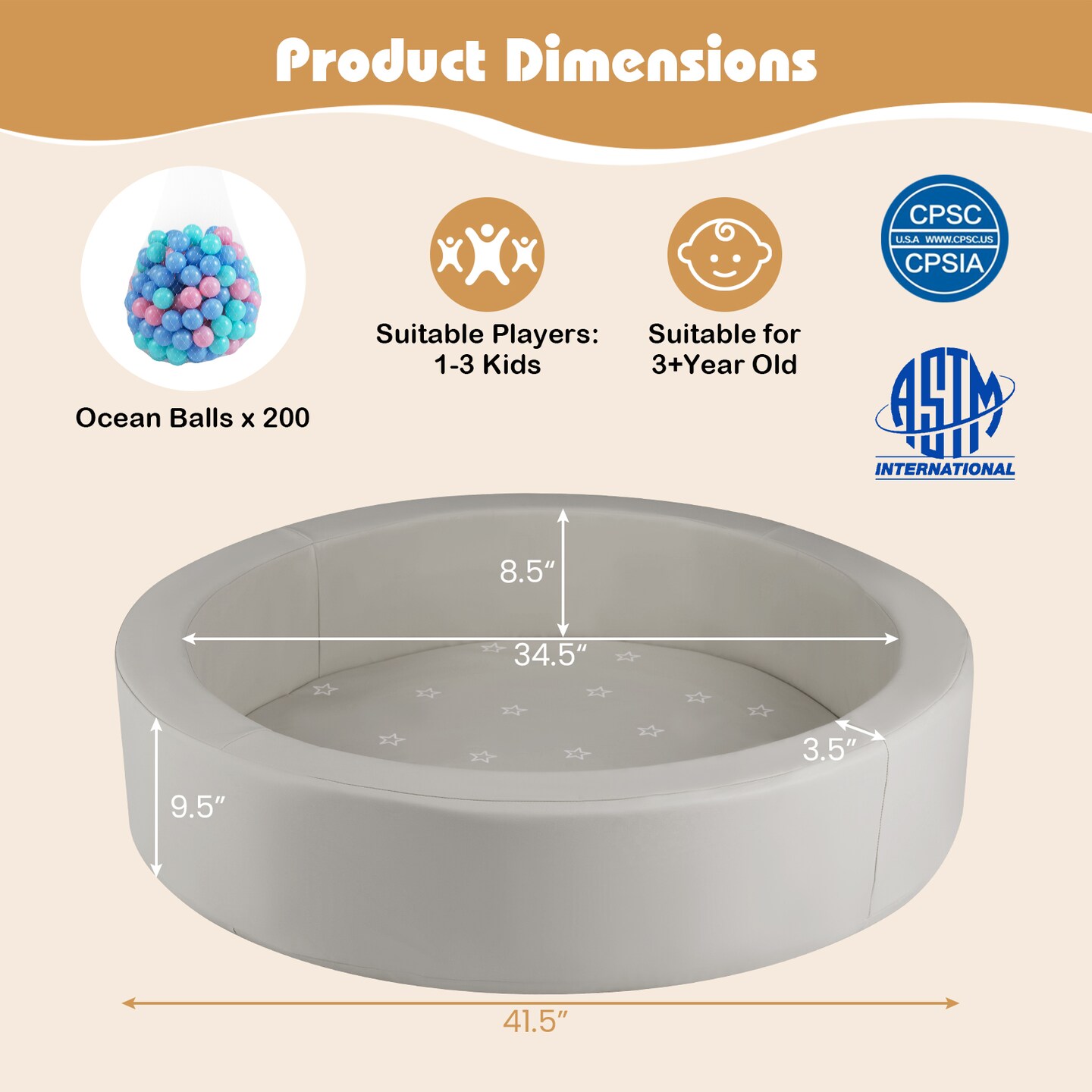 Kids Round Ball Pit with 200 Ocean Balls PU Leather, 41.5” Diameter, 25D Sponge Cushion