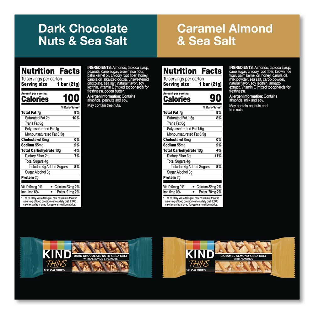 KIND 0.74 oz Thins Bar Variety Pack - Caramel Almond and Sea Salt/Dark Chocolate Nuts and Sea Salt (20/Box)