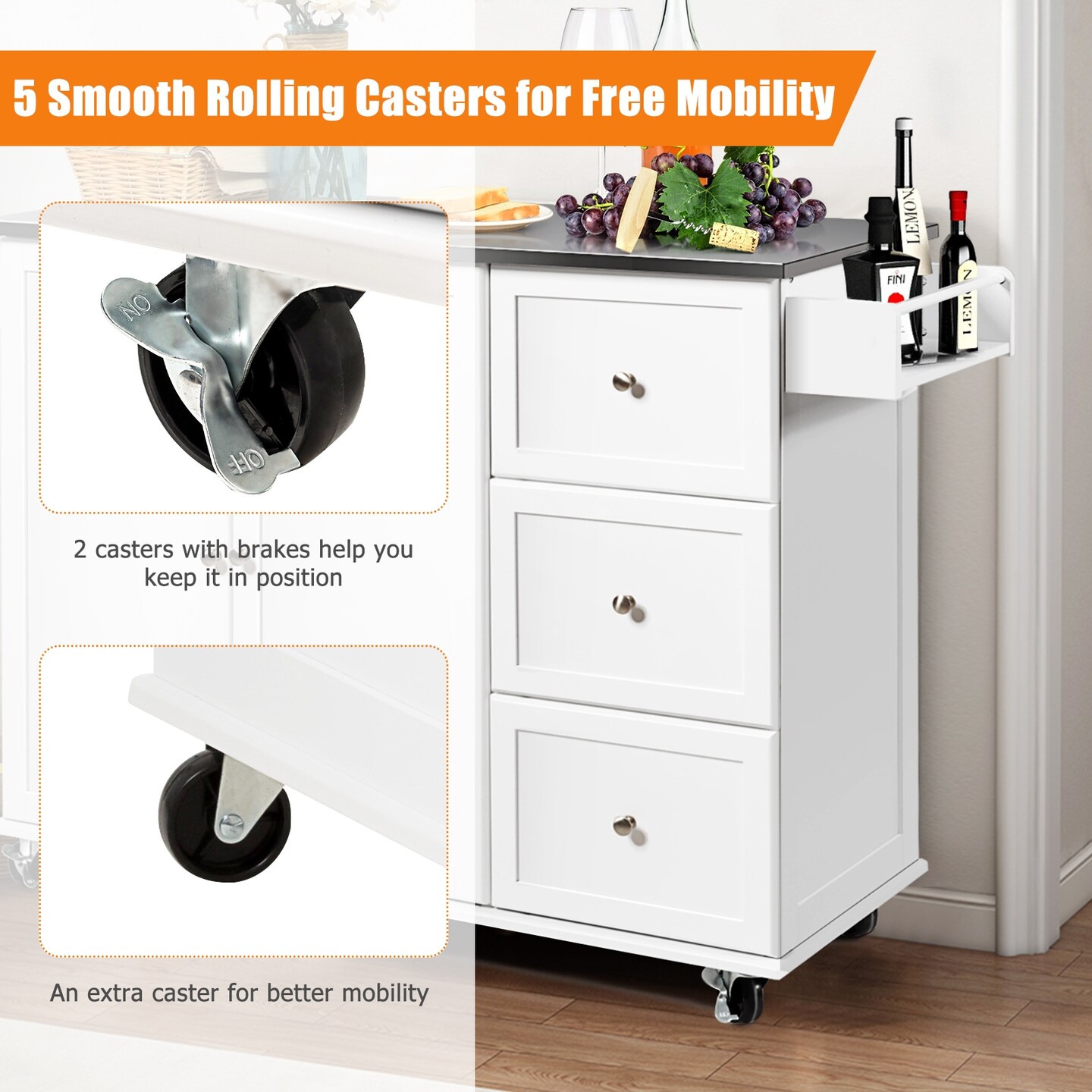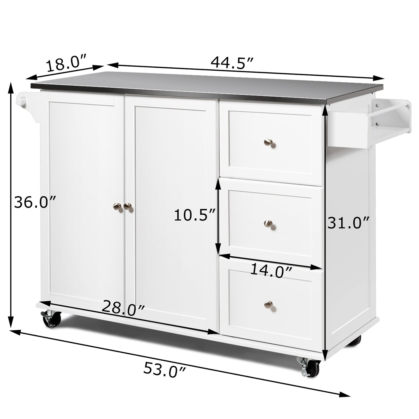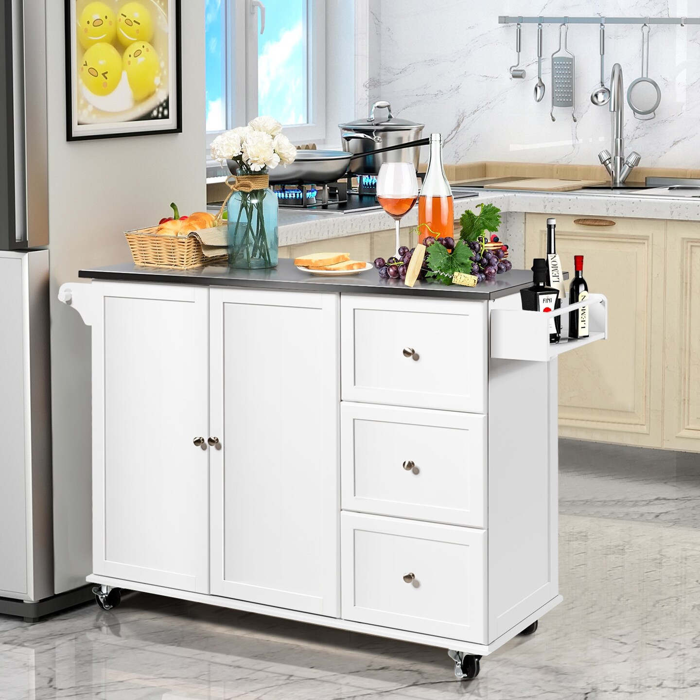 Kitchen Island 2-Door Storage Cabinet with Drawers and Stainless Steel Top