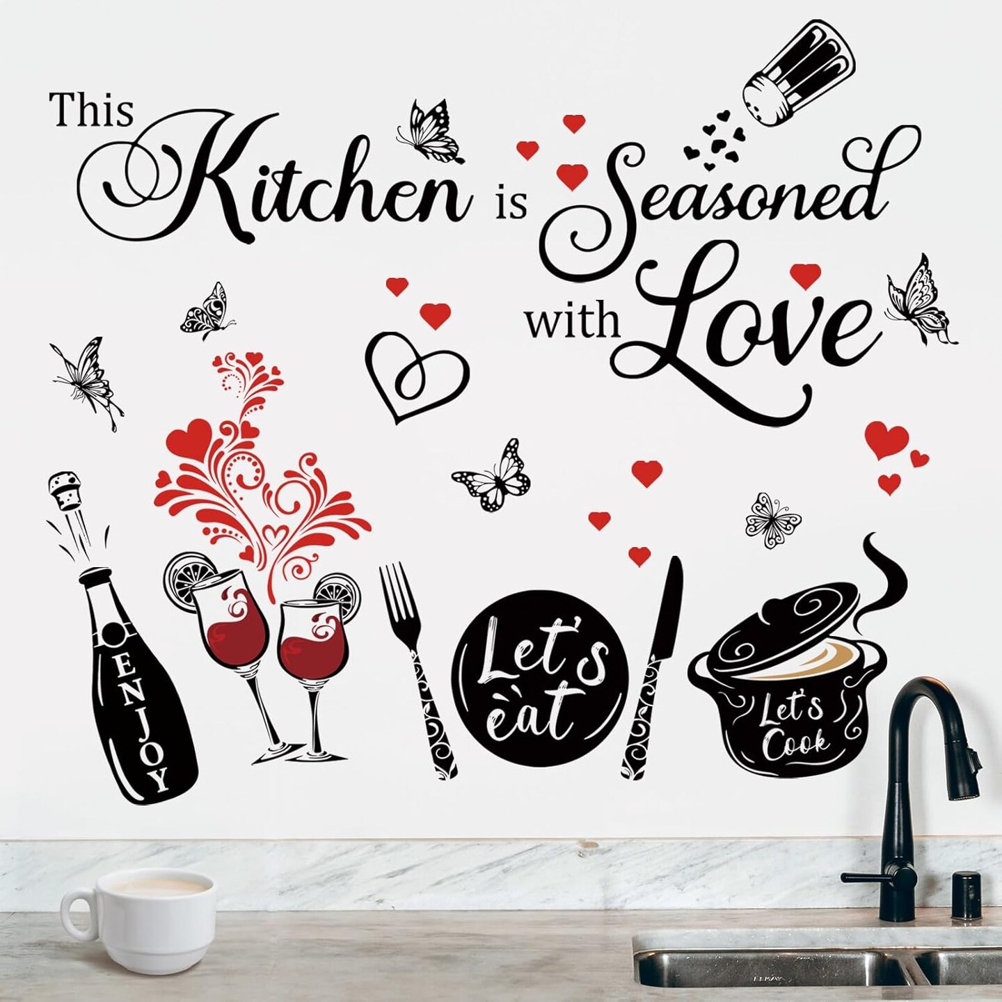 Kitchen Quotes Wall Stickers This Kitchen is Seasoned with Love Saying Red Heart Peel (Multi)