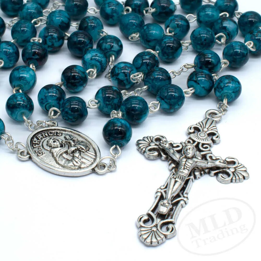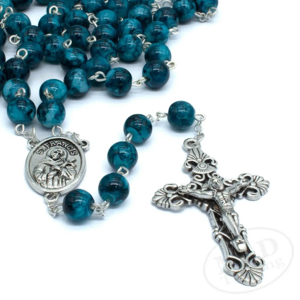 Kitcheniva 22" 8mm Blue Marble Glass Beads Saint St Francis Rosary Necklace