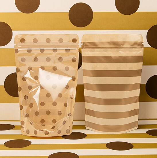Kraft Stand Up Zipper Pouch w/ Gold Dots & Stripes 5 1/8" x 3 1/8" x 8 1/8" 25 pack ZBGSW3SDG