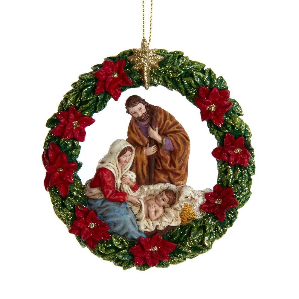 KSA Pack of 12 Green and Red Nativity Wreath with Gold Star Christmas Ornaments 4.25"