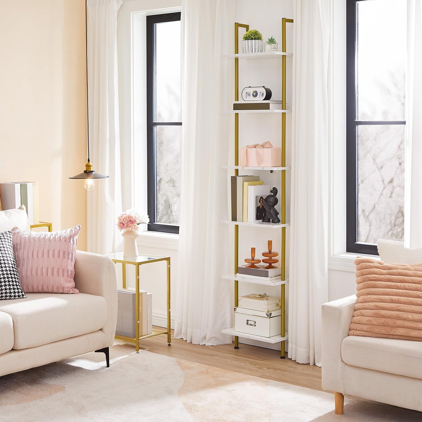 Ladder Bookshelf 6-Tier Narrow Storage Shelves Metal Frame Marble