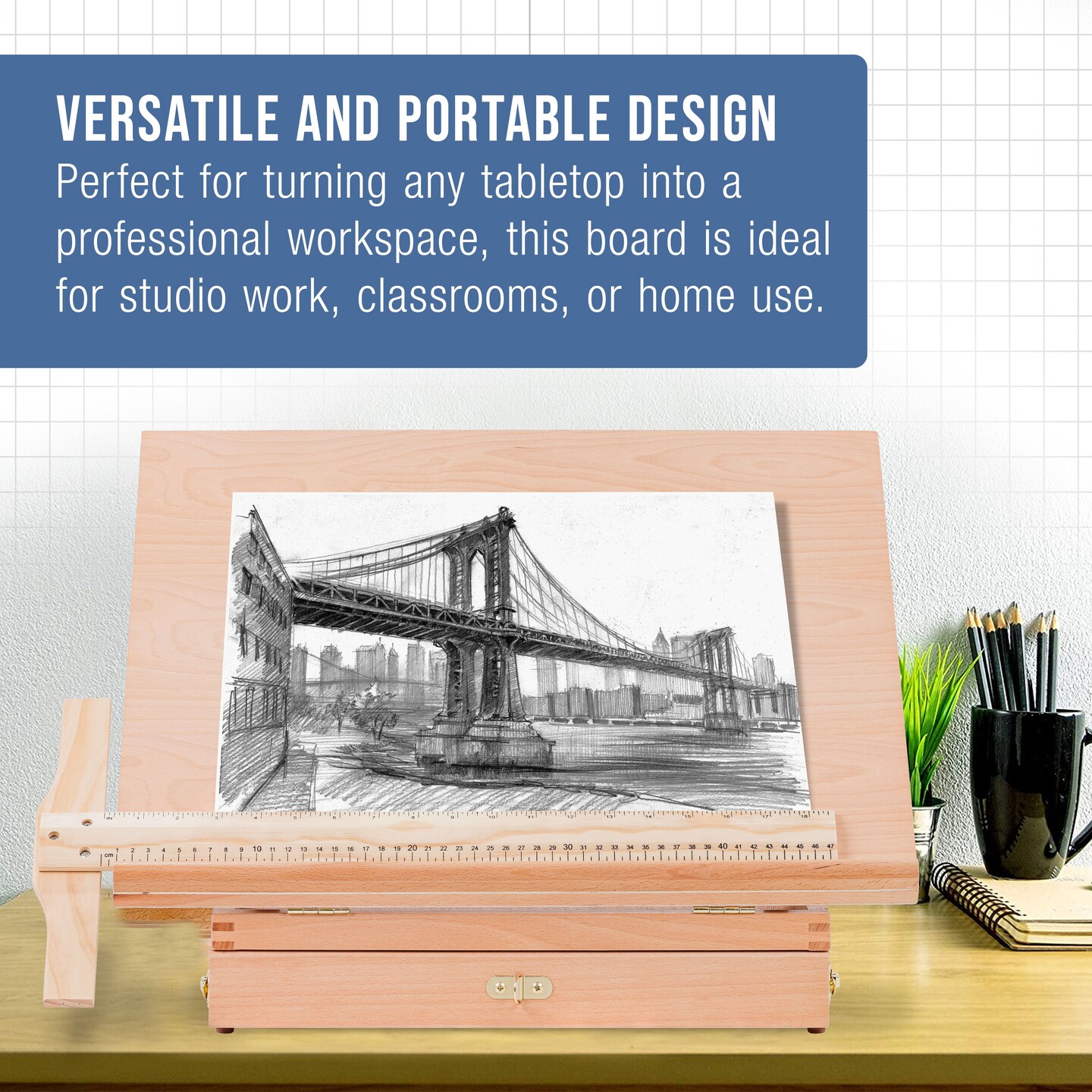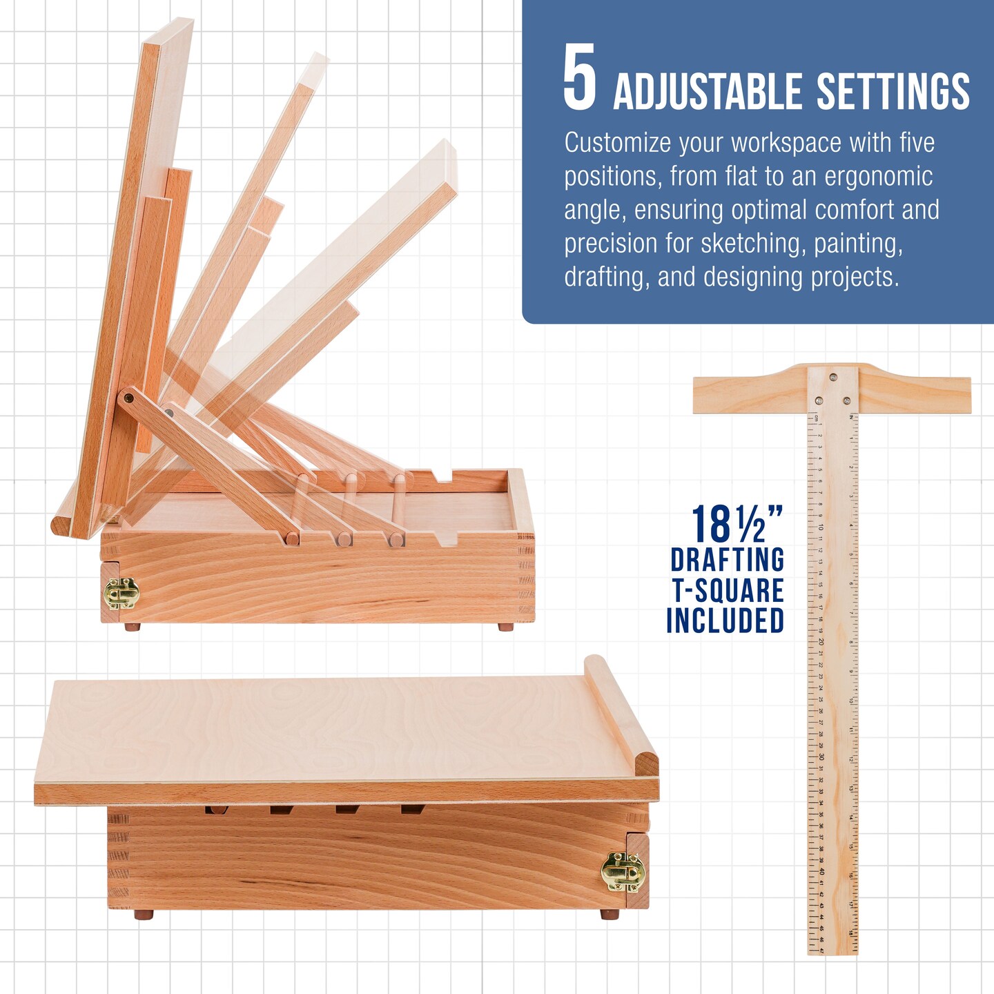 Large 20-1/2" x 16" Wooden Drawing Board, Adjustable Table Top Easel for Painting and Drawing - Drafting Board with T-Square, Pencil Ledge, Locking Storage Drawer