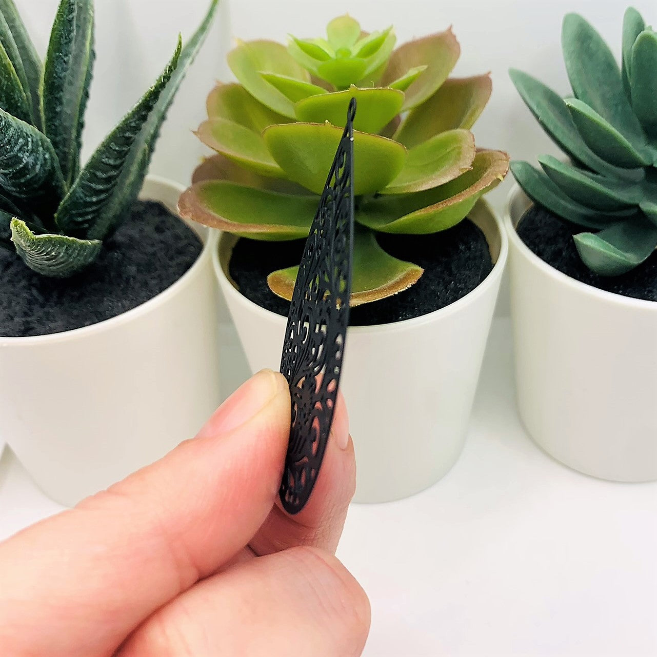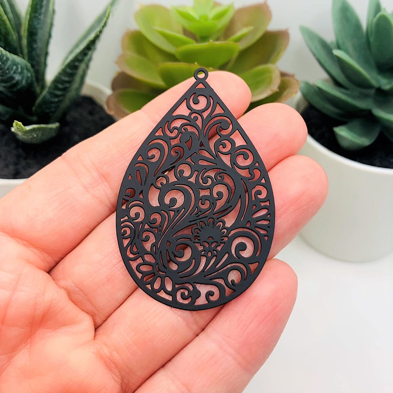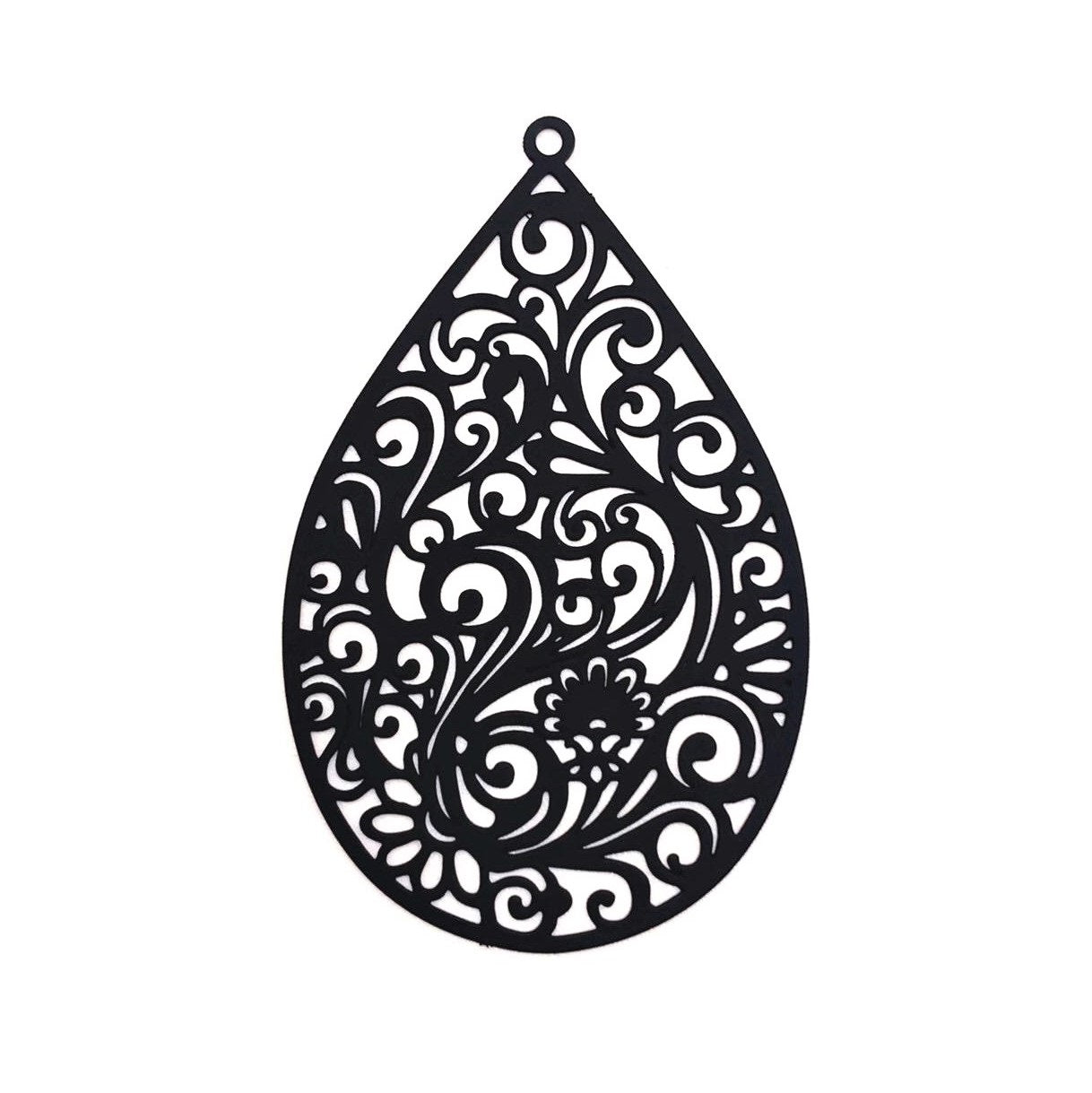 Large Black Filigree Teardrop Pendants, 55x34mm