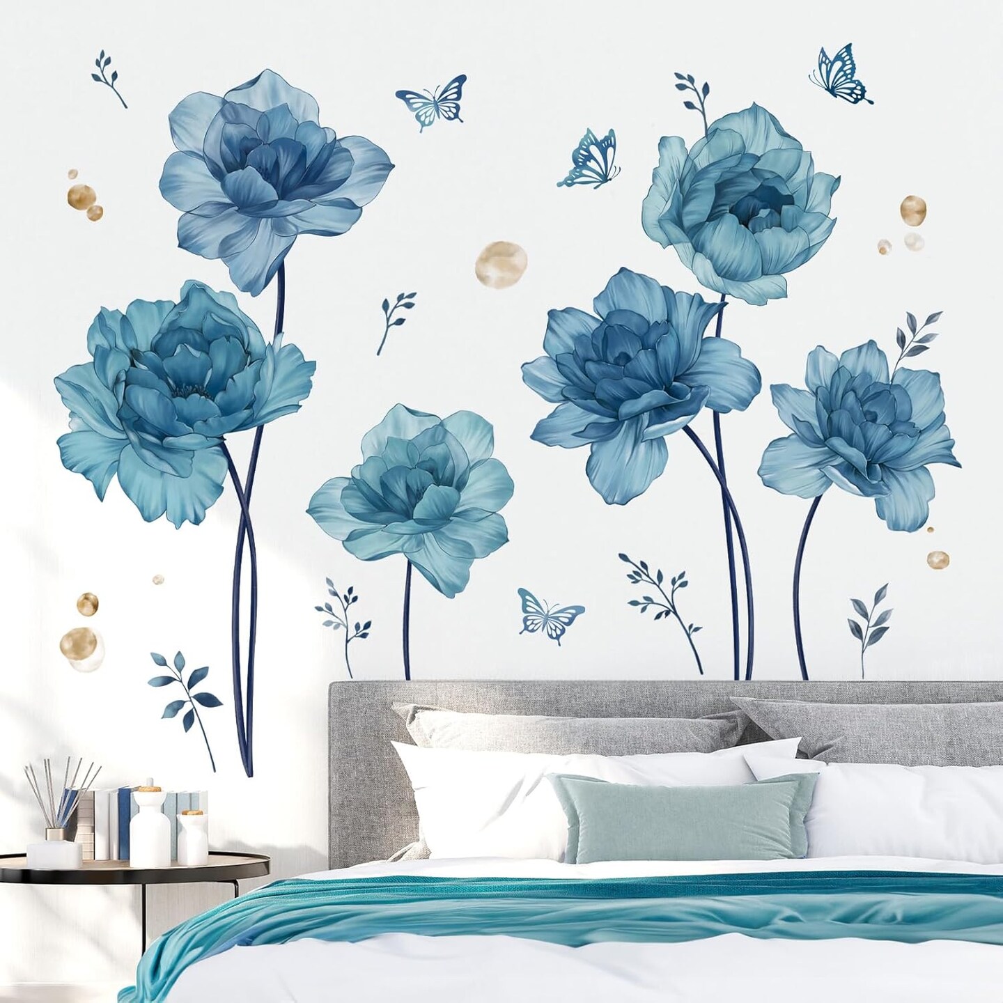 Large Blue Flowers Wall Stickers Peony Floral Plants Butterfly Peel