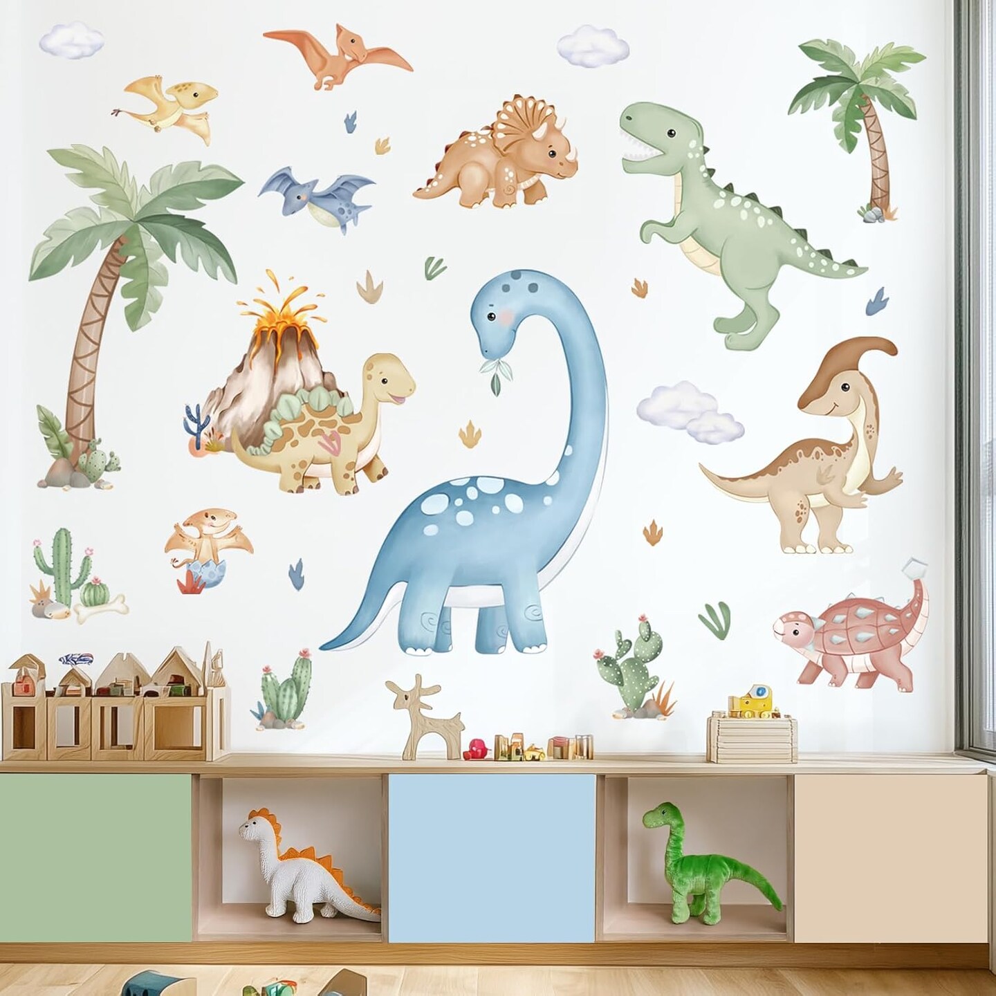 Large Boho Dinosaur Wall Stickers Watercolor Dino Tropical Plants Volcano Peel(Multi)