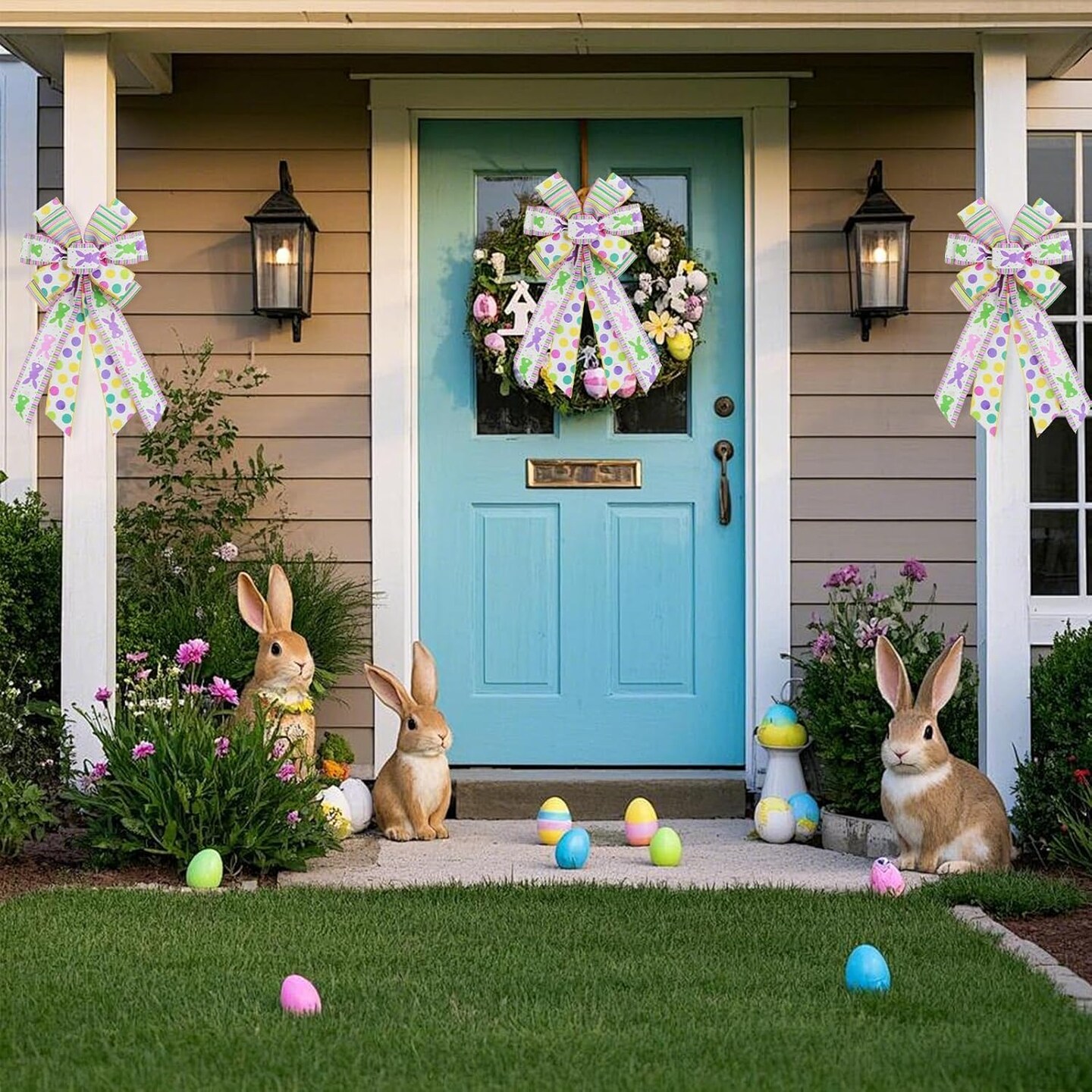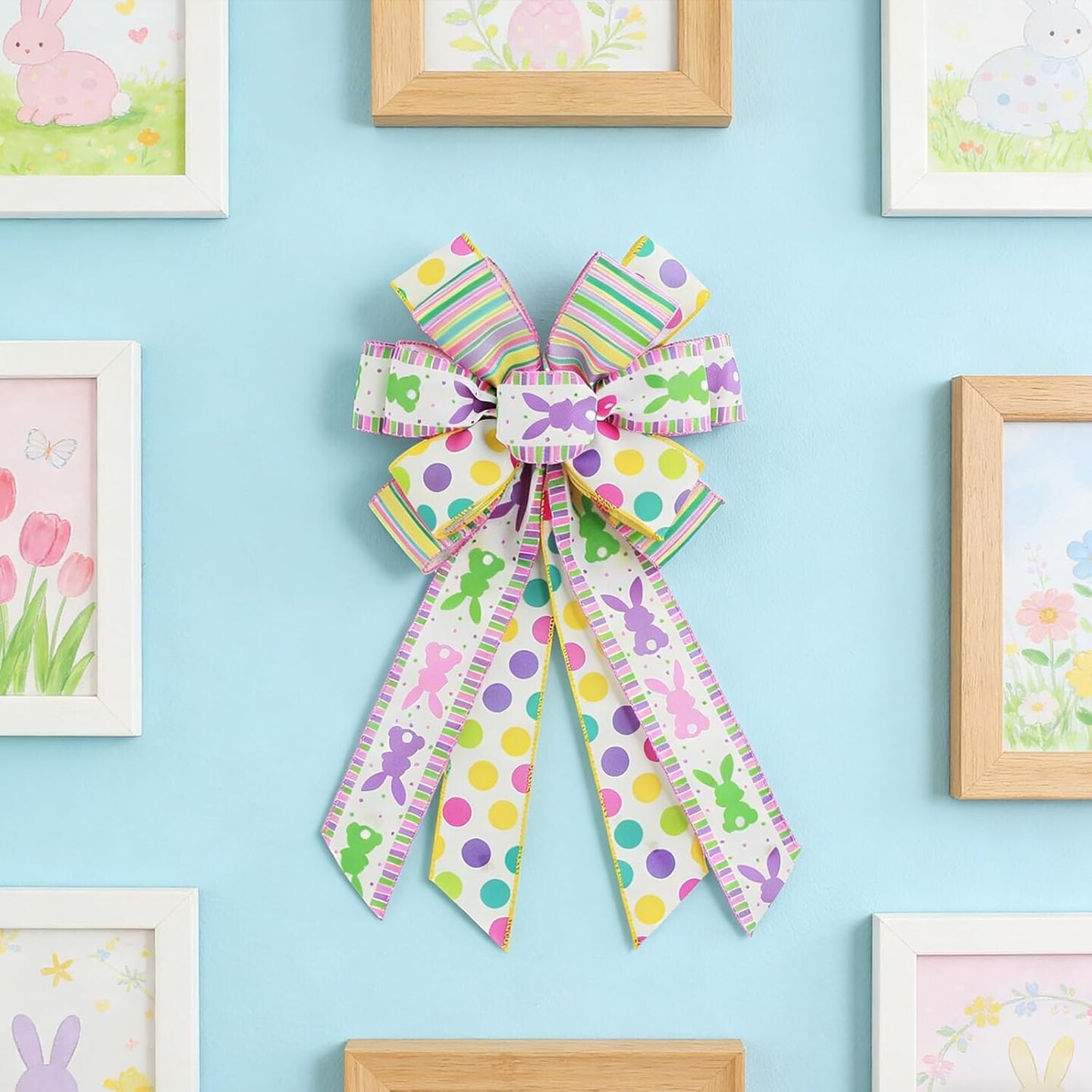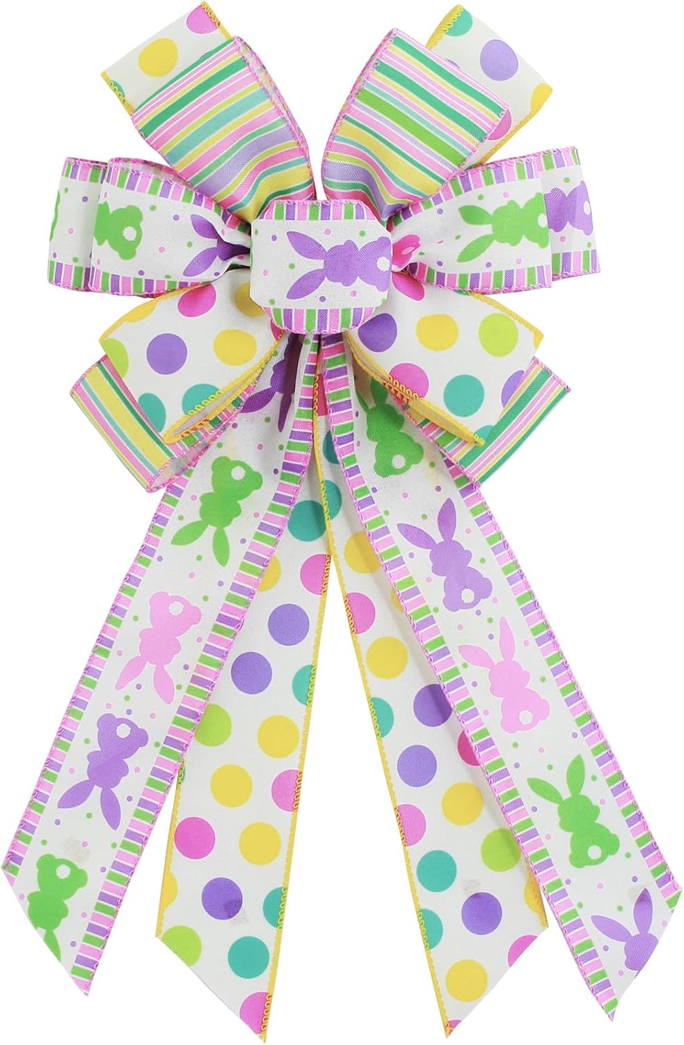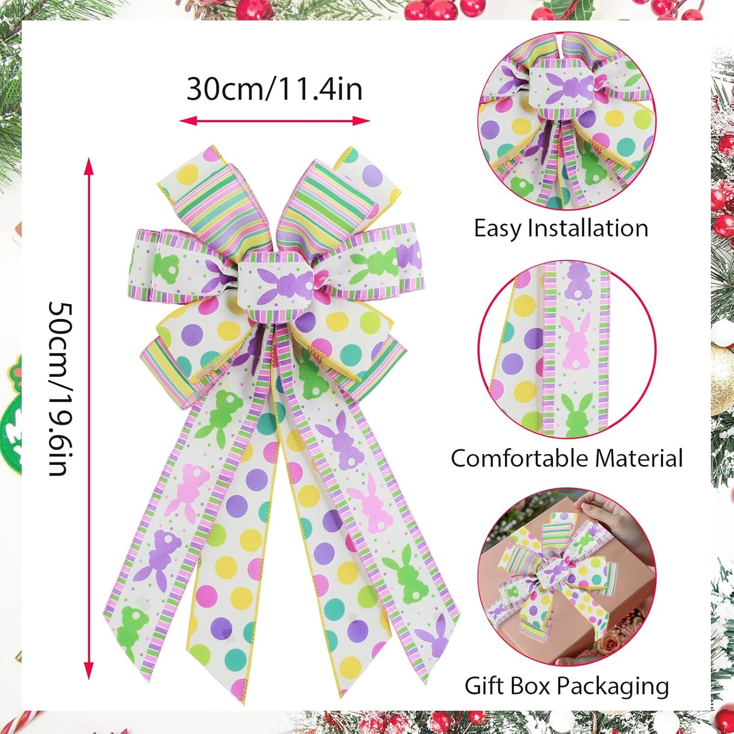 Large Easter Wreath Bows White Purple Bunnies Dots Spring Wreath Bows 11.4”x19.6” Easter Rabbits Pattern Ribbons Burlap Ornaments for Front Door Wrapped Garland Wedding Party Home Decor