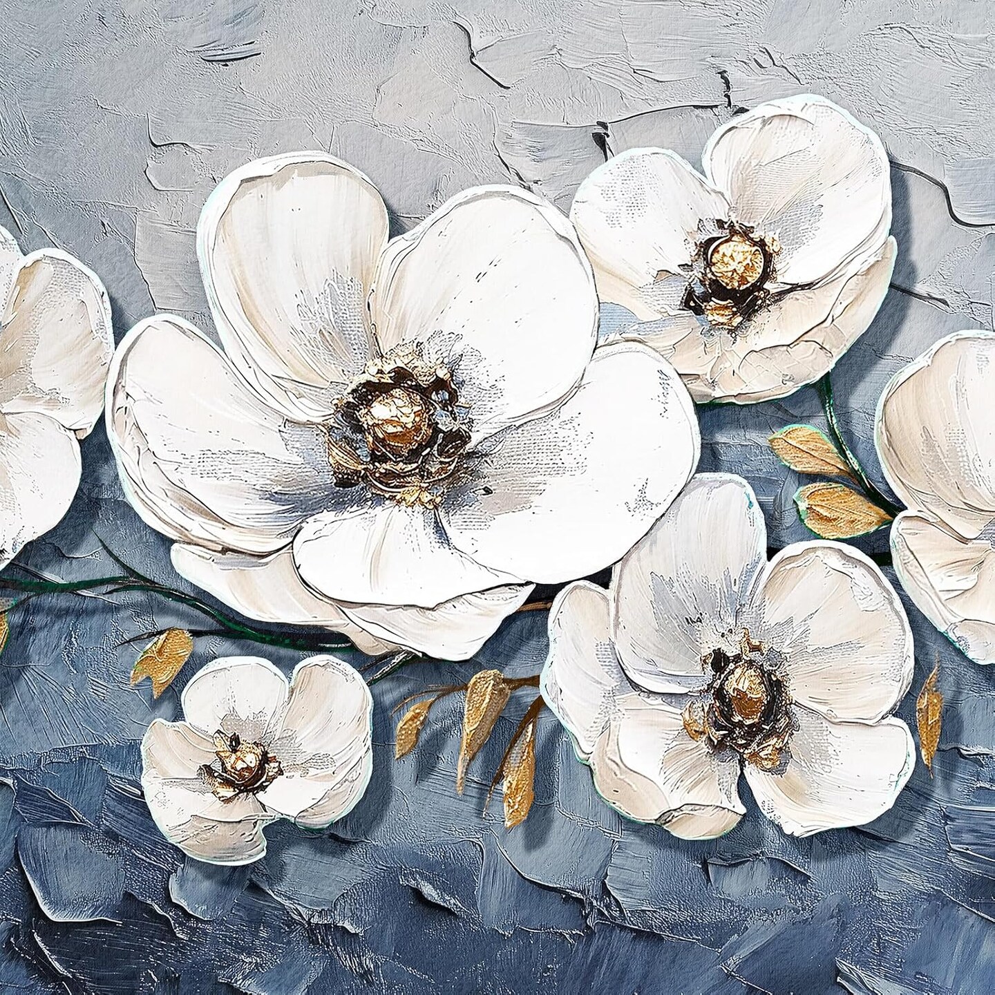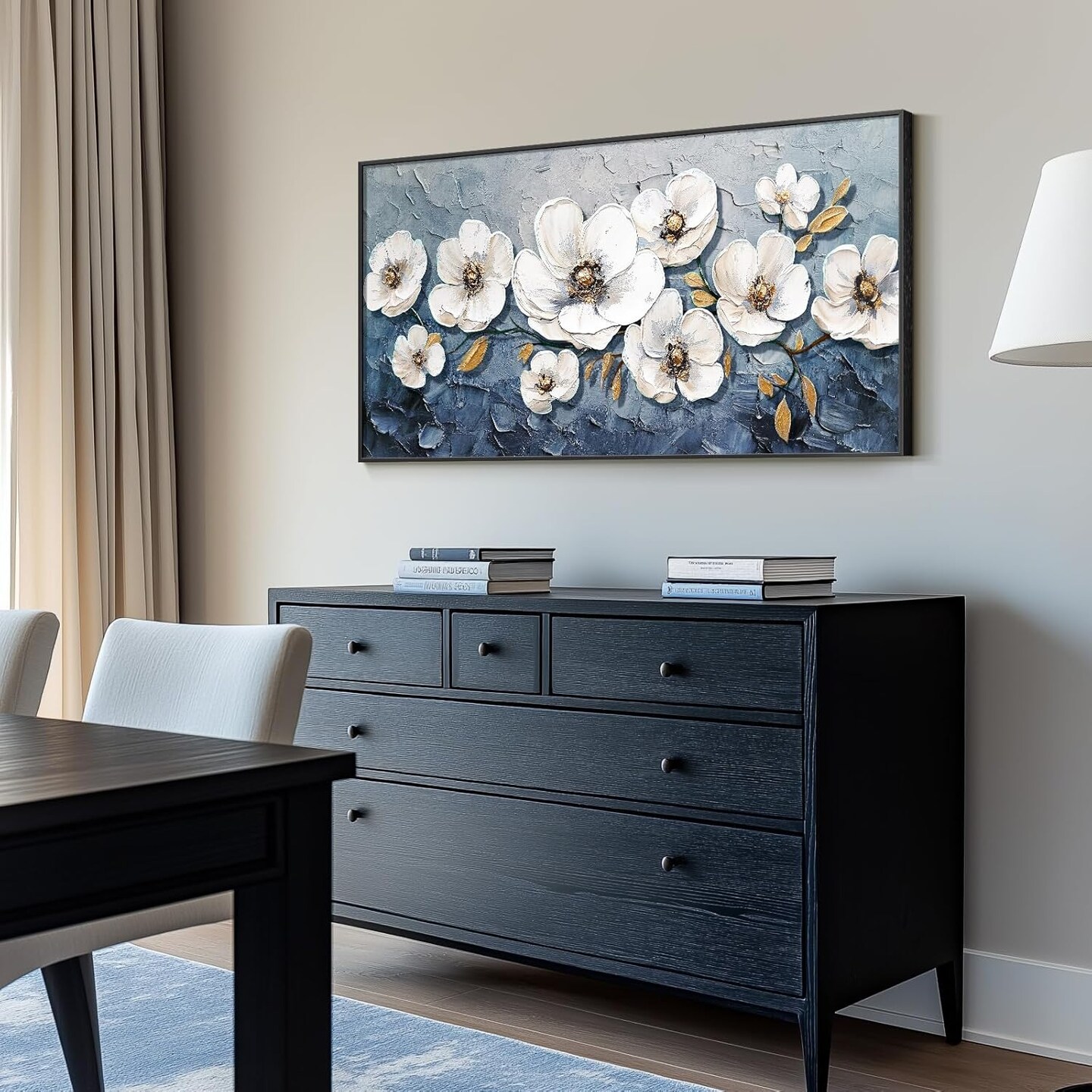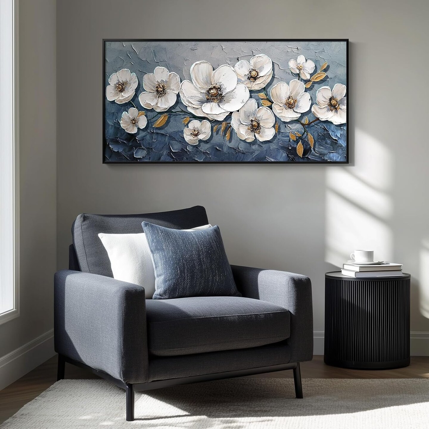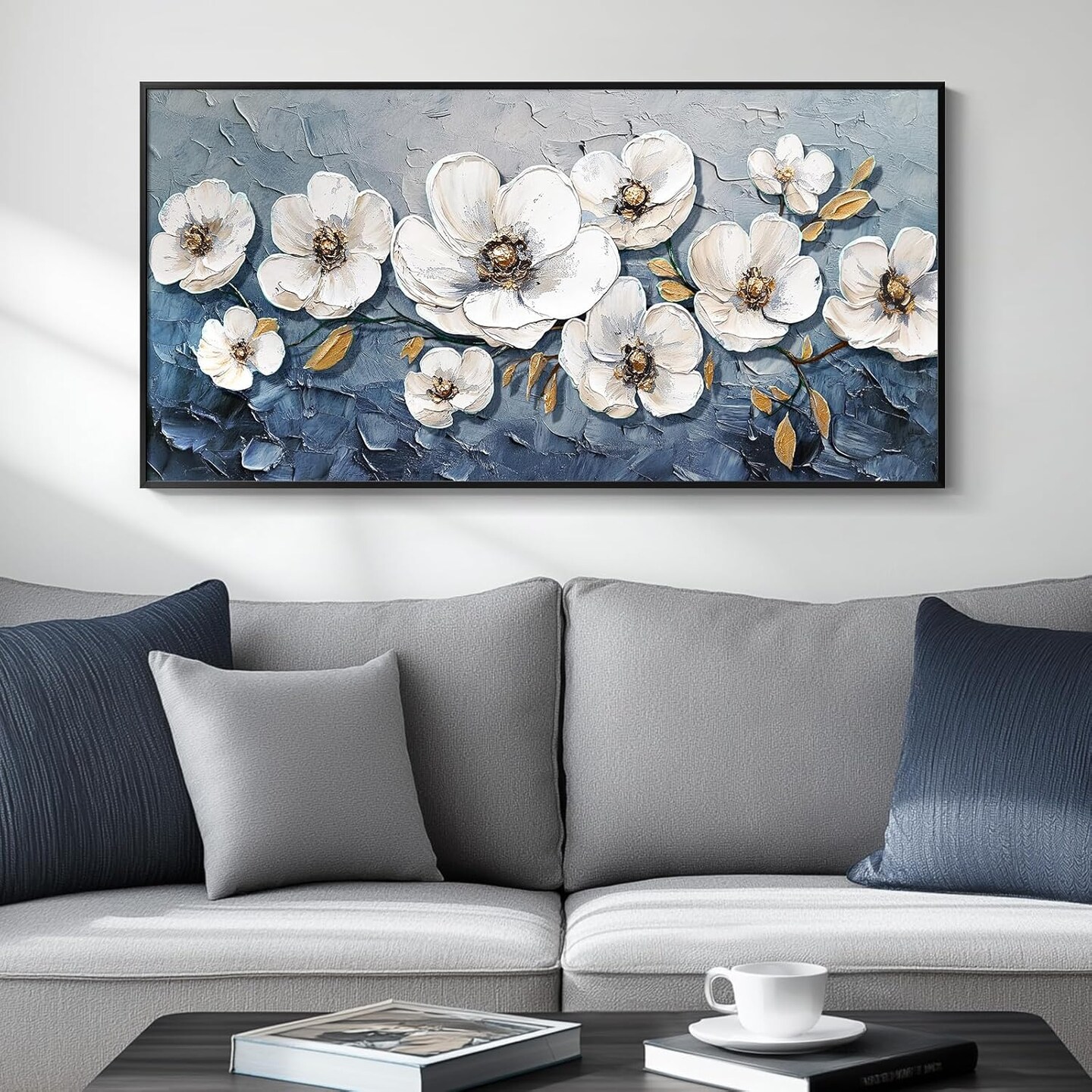 Large Framed Abstract Blue and White Floral Wall Art for Living Room (20x40 Inch)