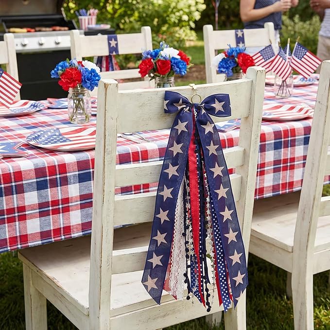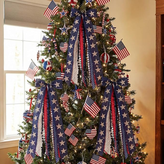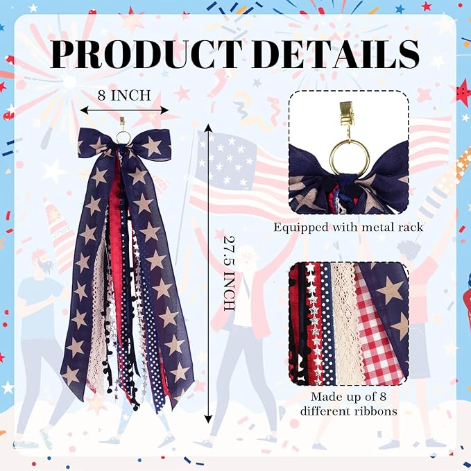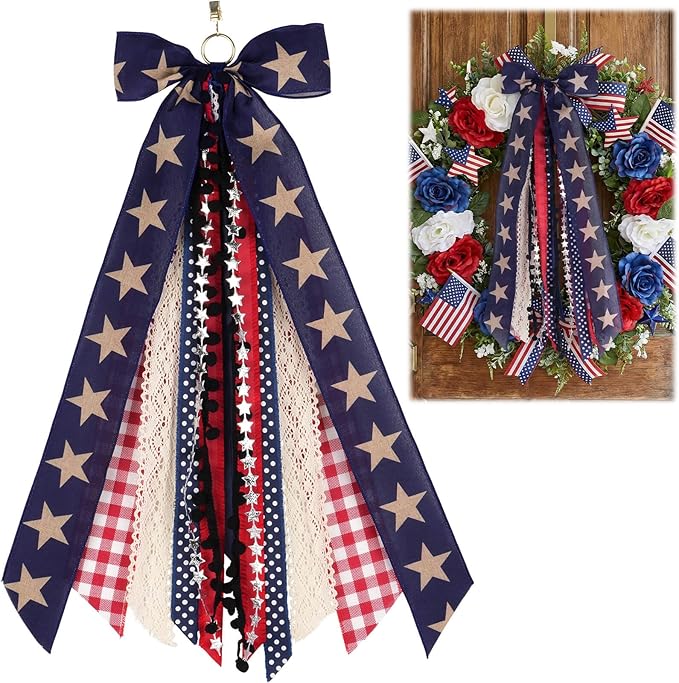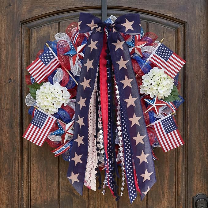 Large Patriotic Front Door Wreath Sash, 8‑Ribbon Red White Blue Star Bow with Metal Clip, Wired Edge Americana Decor for 4th of July & Memorial Day