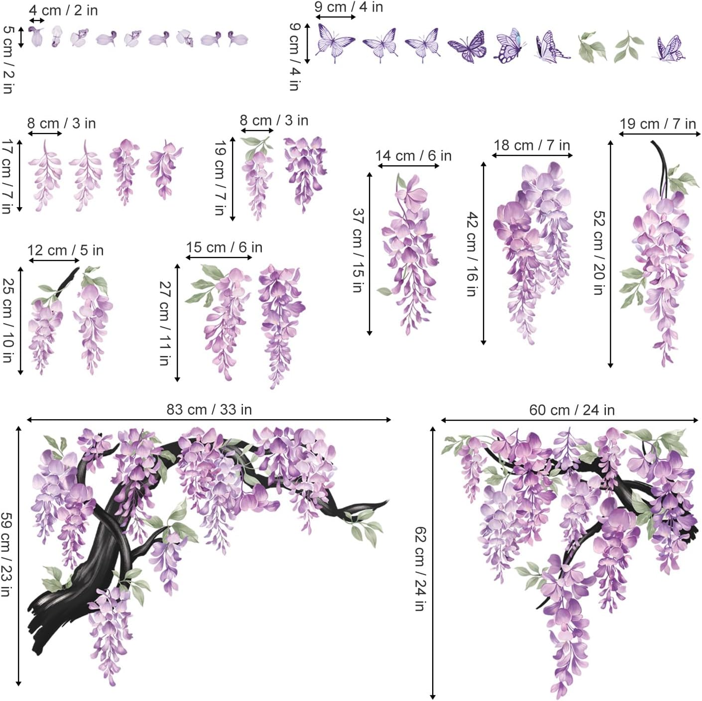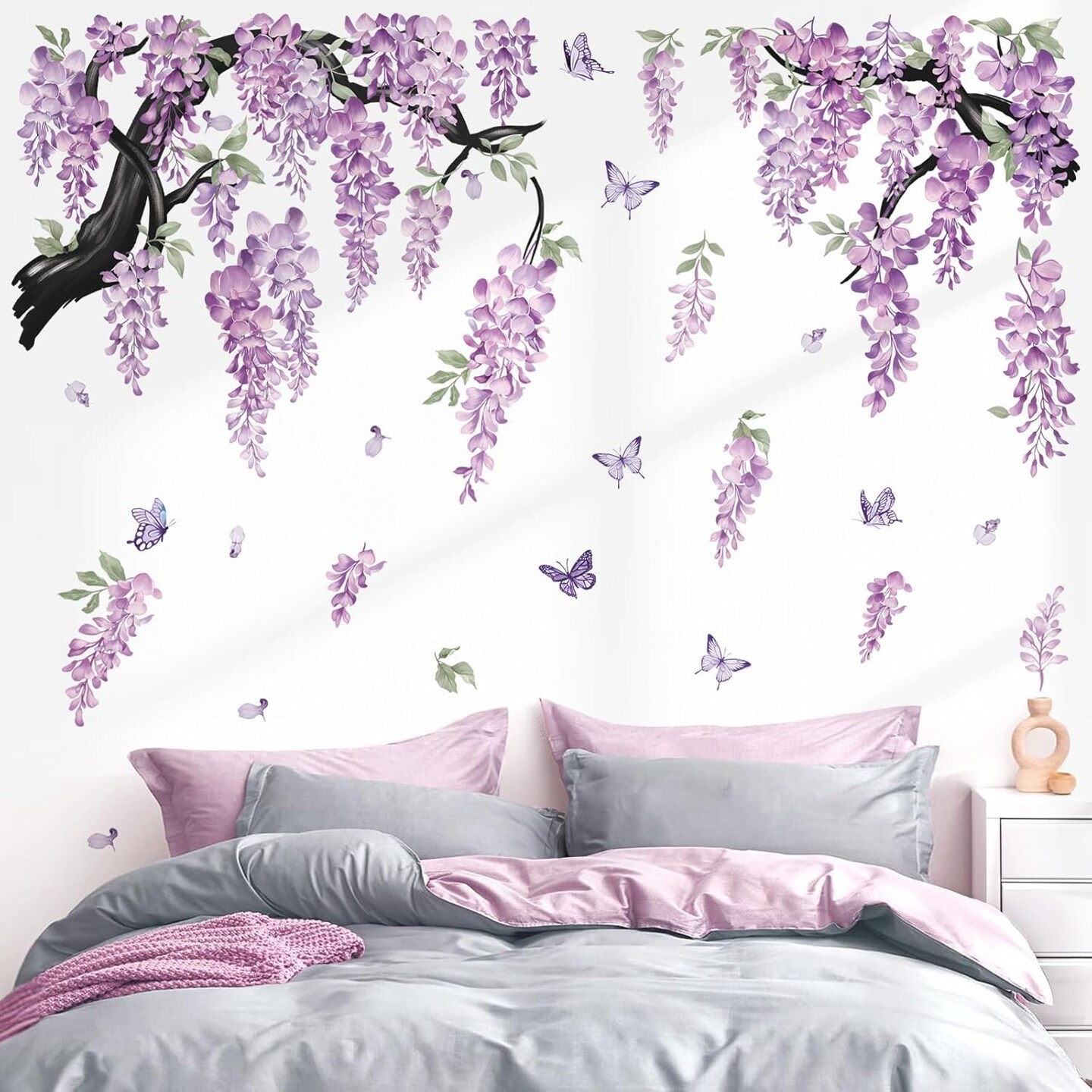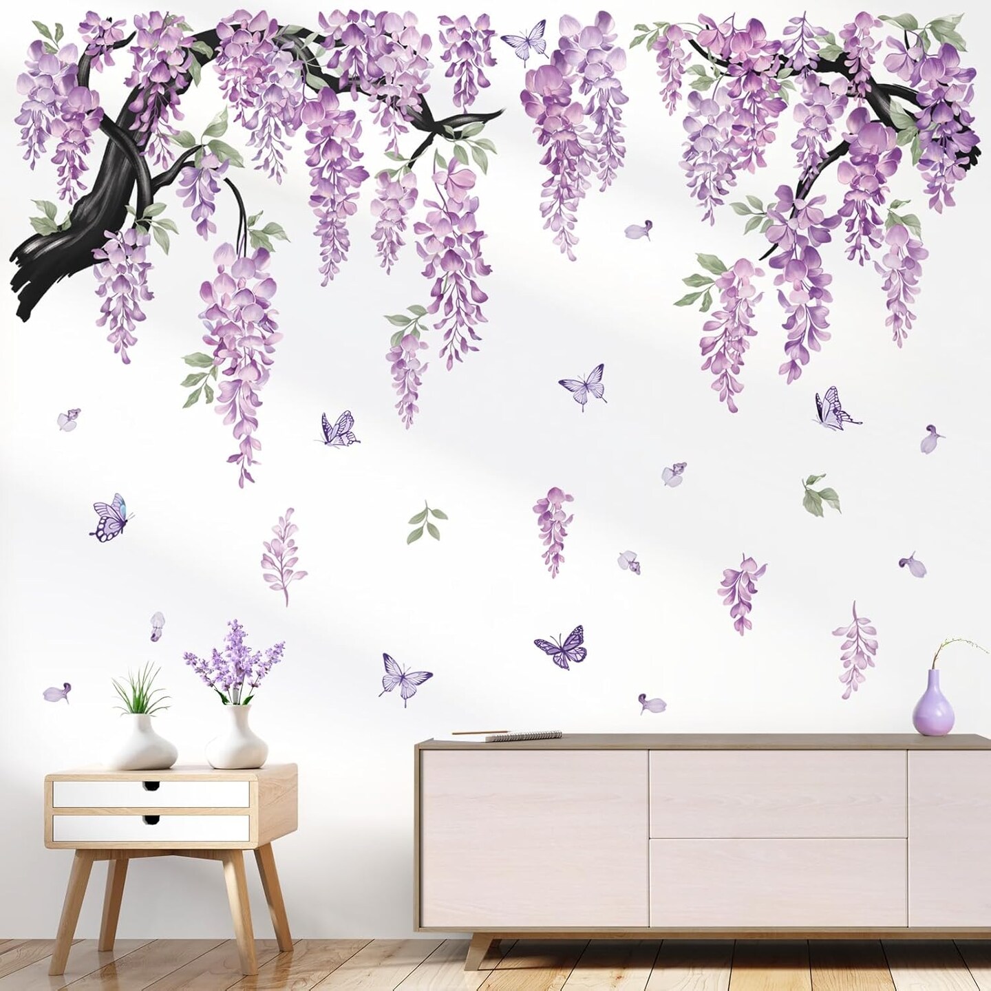 Large Purple Flower Tree Wall Stickers – Hanging Vines & Butterflies Peel & Stick Decals