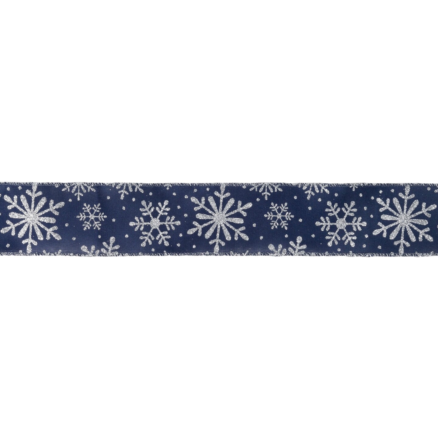 LaRibbons 2 1/2" Faux Linen Wired Ribbon | Blue w/ Giltter Silver Snowflake | 25 Yard Roll