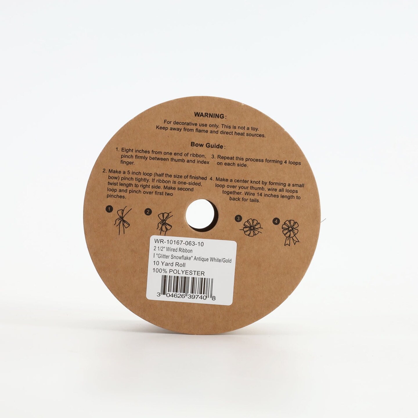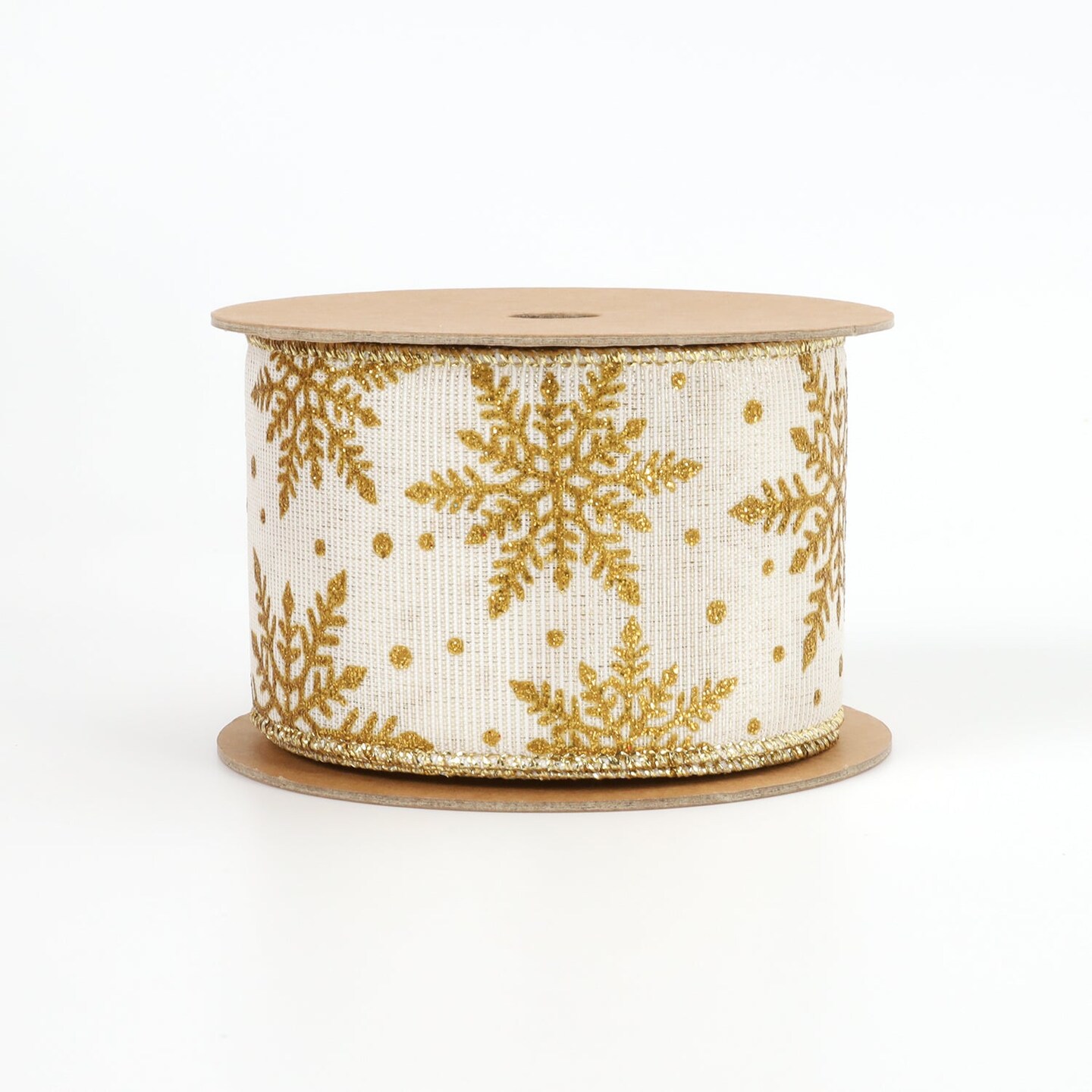 LaRibbons 2 1/2" Wired Ribbon | "Glitter Snowflake" Antique White/Gold | 10 Yard Roll