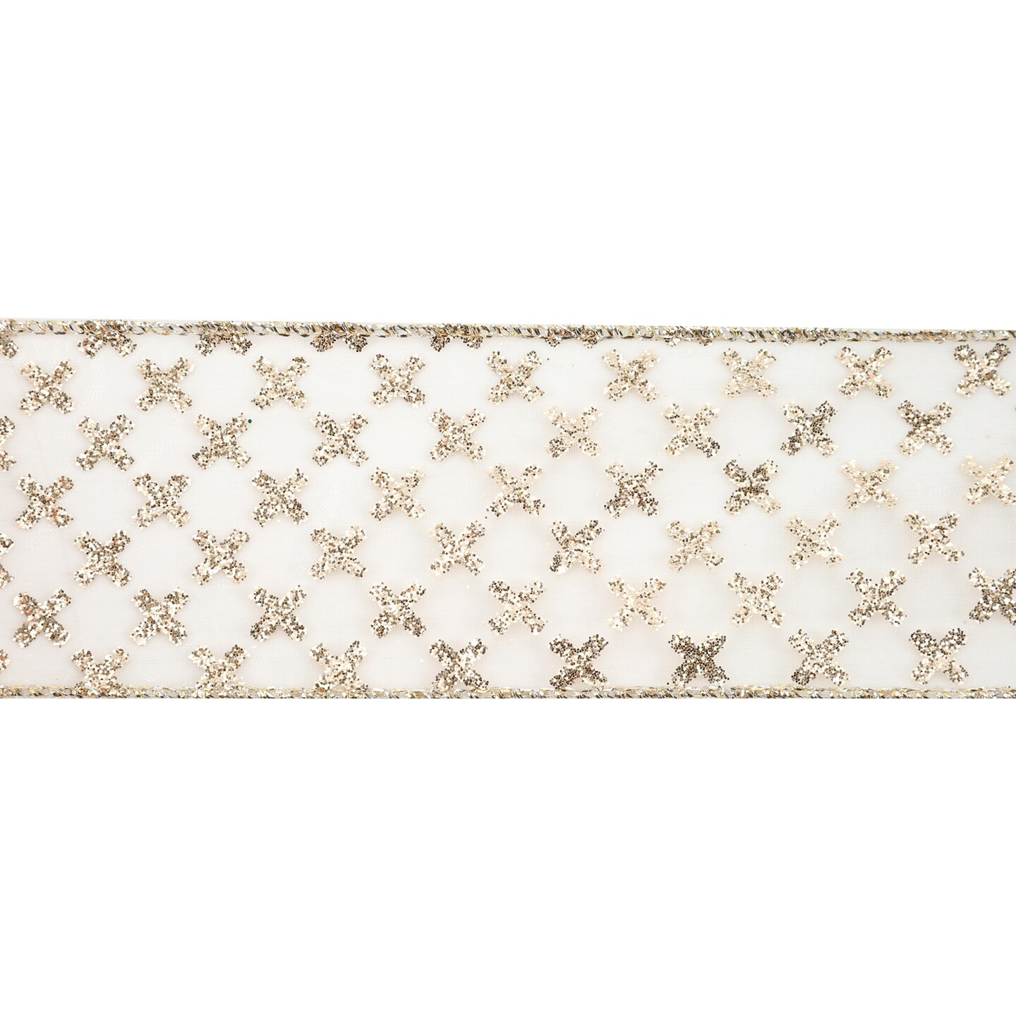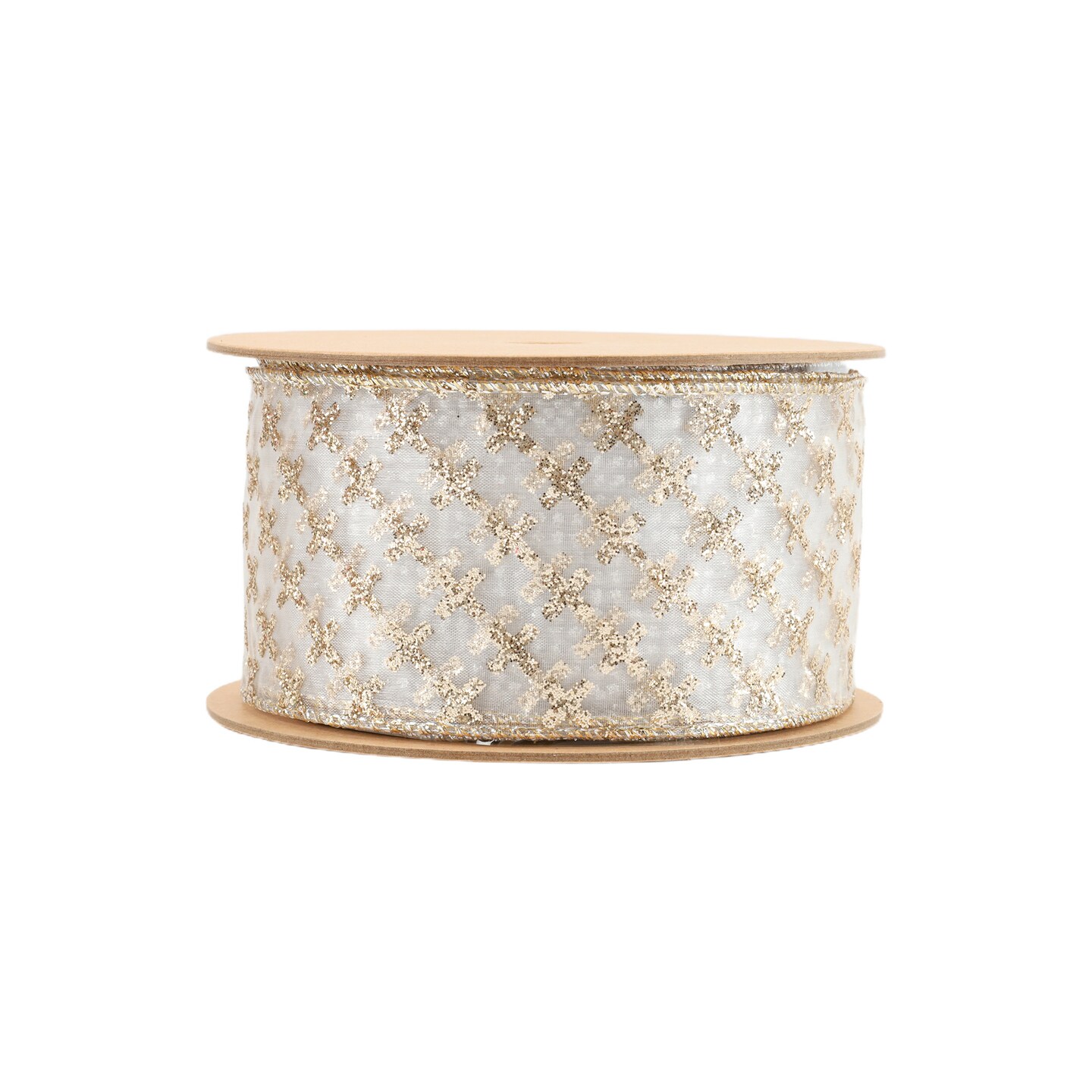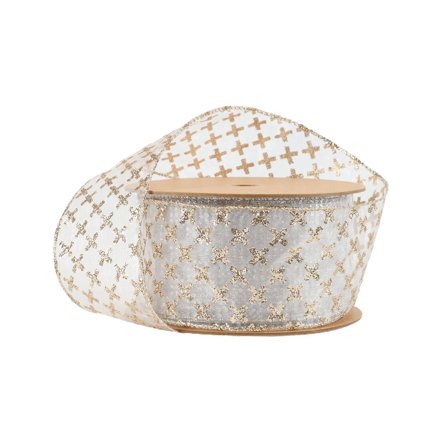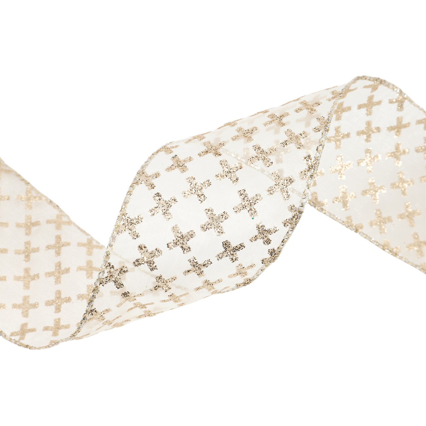 LaRibbons 2 1/2" Wired Ribbon | Gold Cross on White | 10 Yard Roll