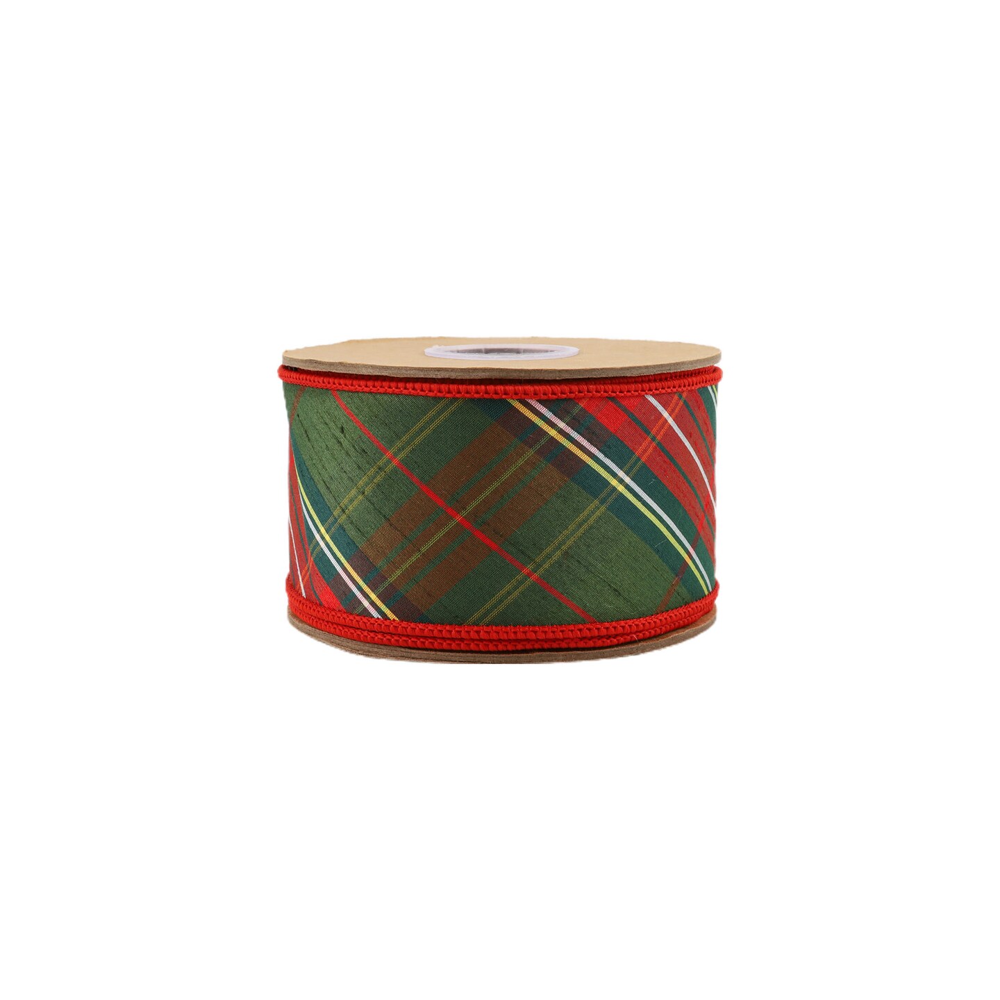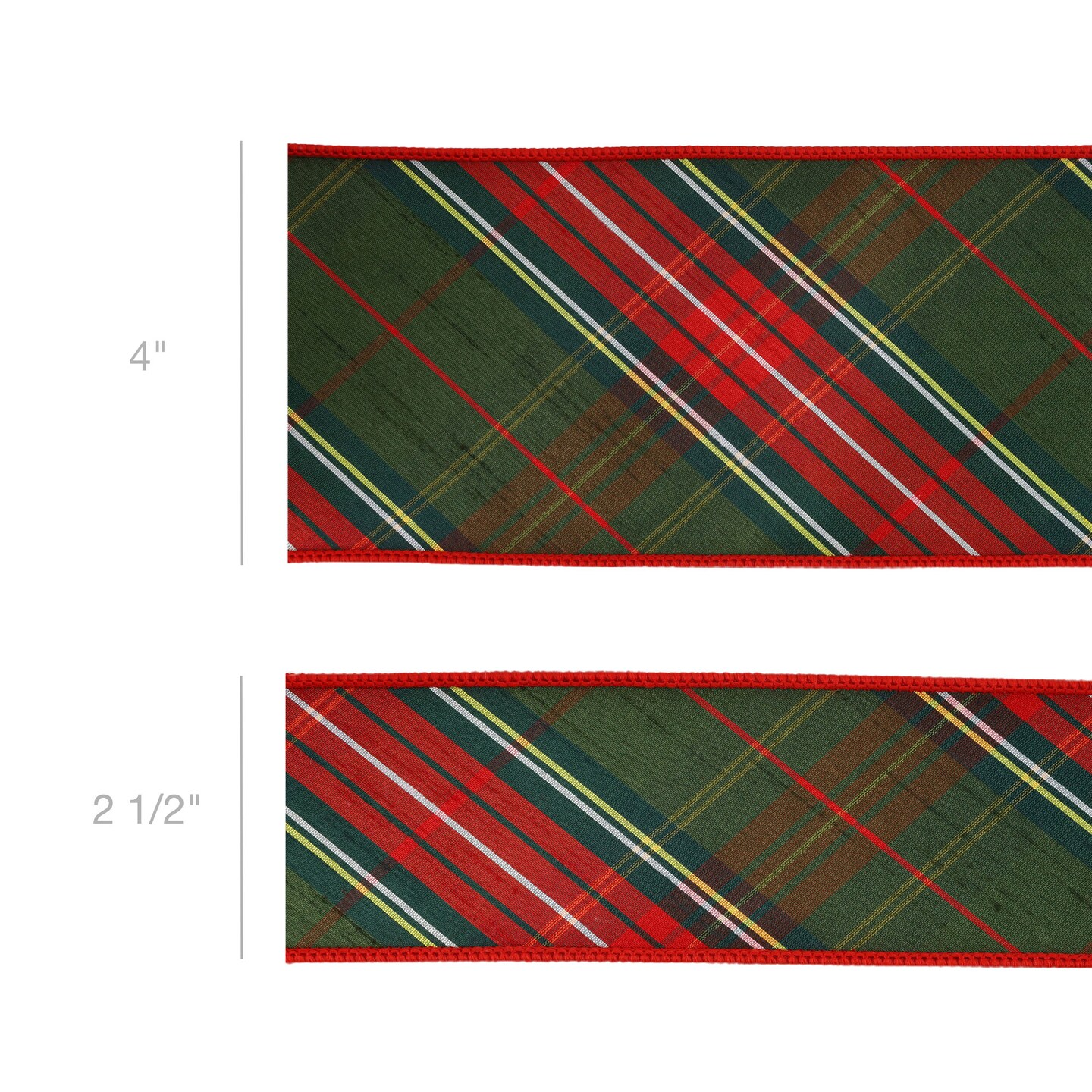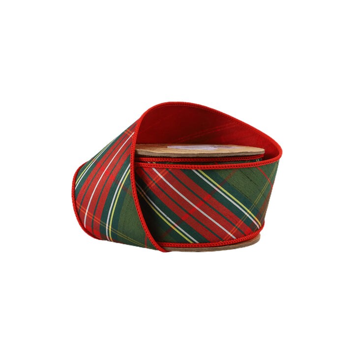 LaRibbons 4" - 2 1/2" Wired Dupioni Ribbon | Red/Dark Green Plaid Bias Cut Double-Fused Red Backing | 5 Yard Roll