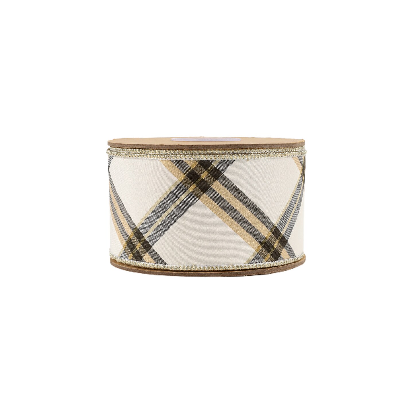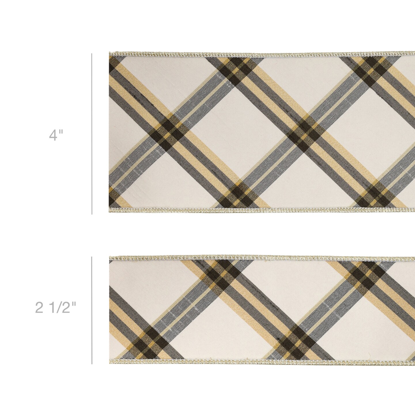 LaRibbons 4" - 2 1/2" Wired Ribbon | Ivory/Black/Gold Bias Cut Plaid | 5 Yard Roll