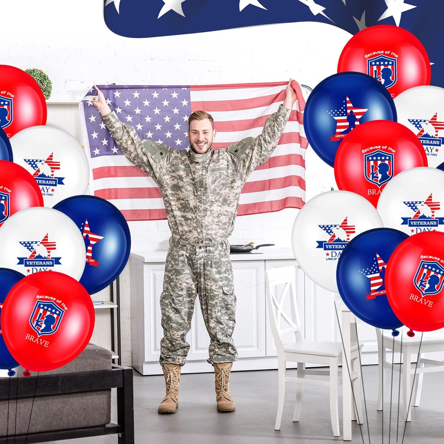 Latex Balloons 60PCS Red, White & Blue Veterans Balloons – American Flag & “Happy Day” Printed Party Supplies for Memorial Day, Patriotic Celebrations & USA Parties