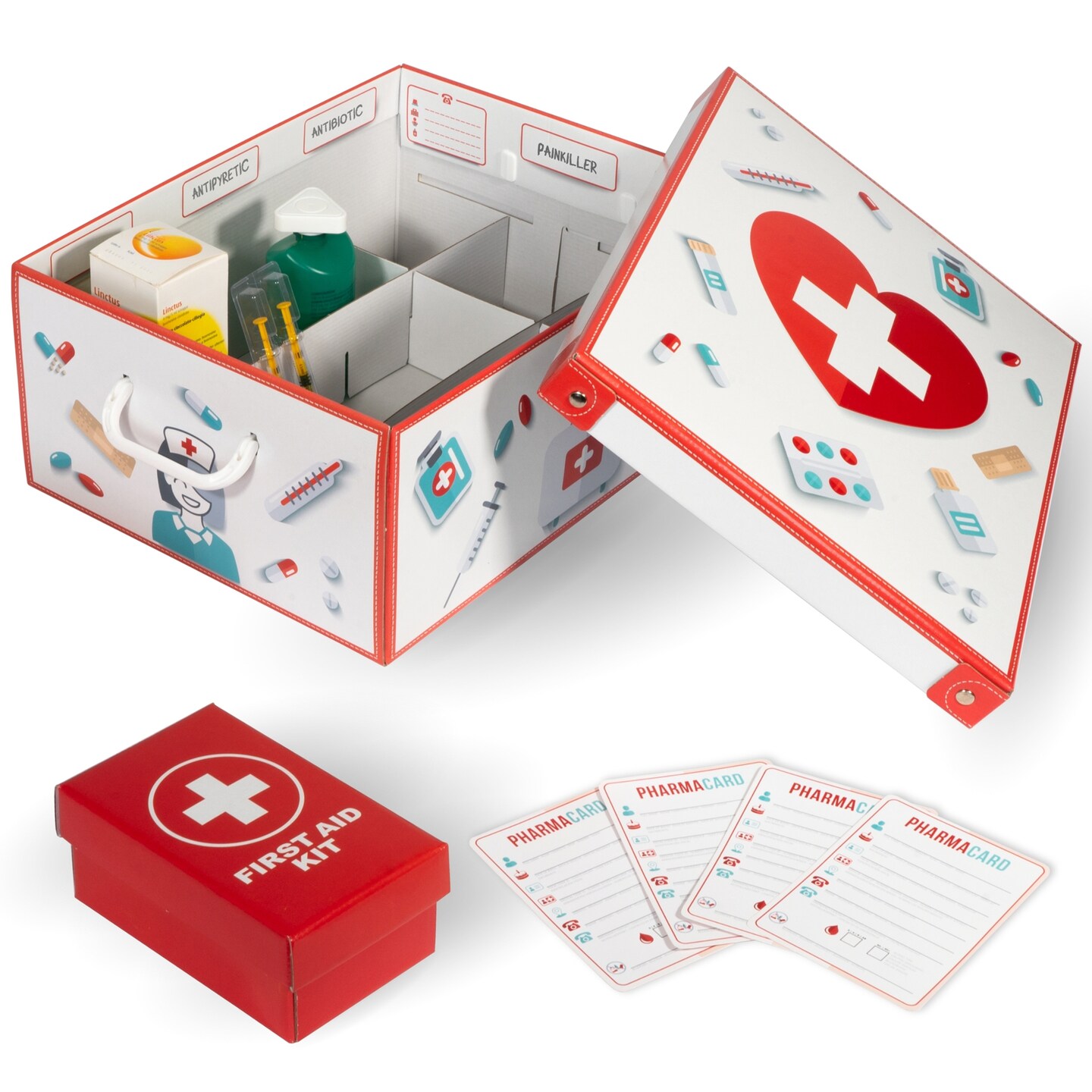 Lavatelli: Medicine Organizer Box - Lid-Handles-Dividers, Decorative Cardboard Storage, First Aid Info Cards, Supplies Container, 16.5 x 12.6 x 6.9"