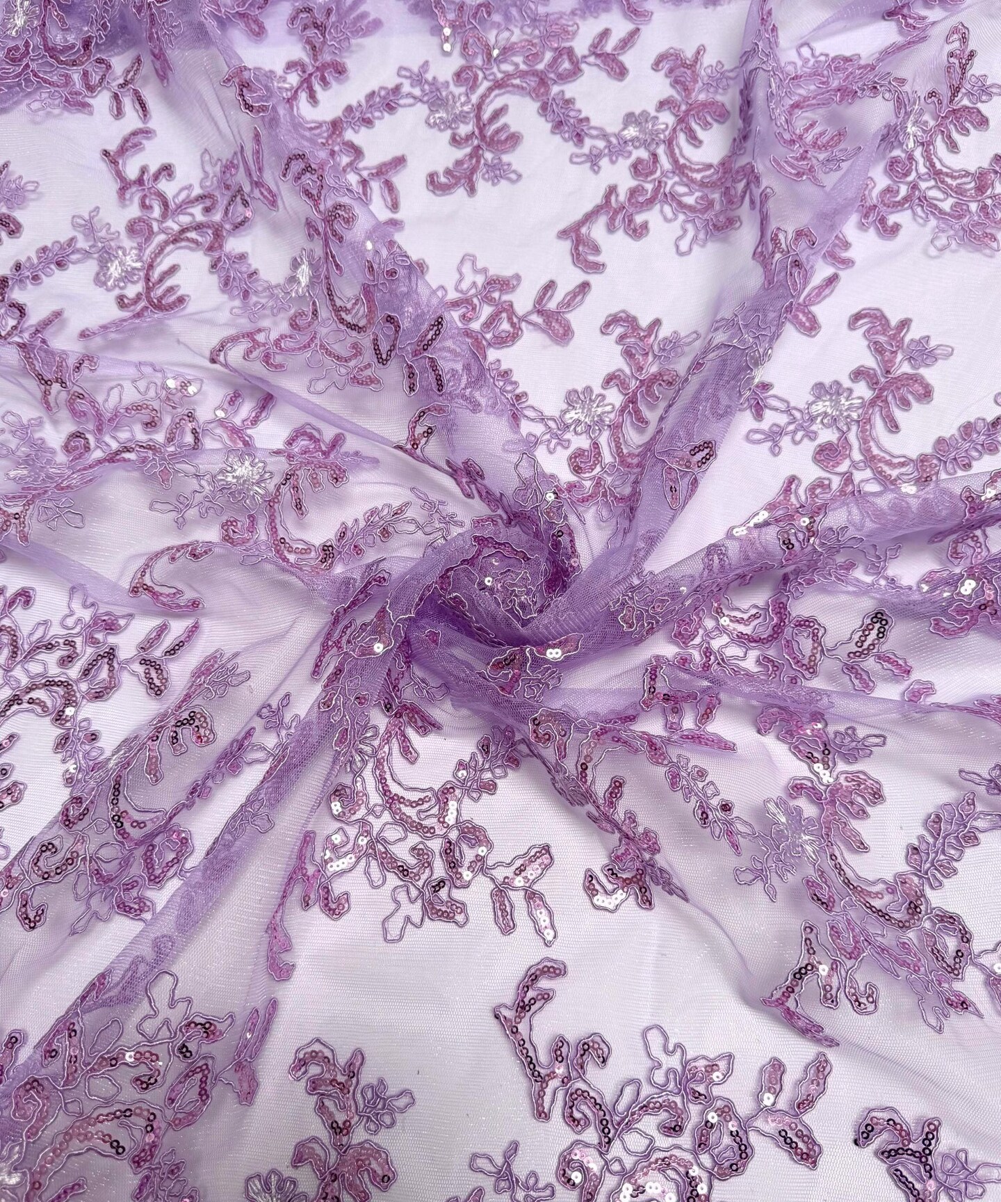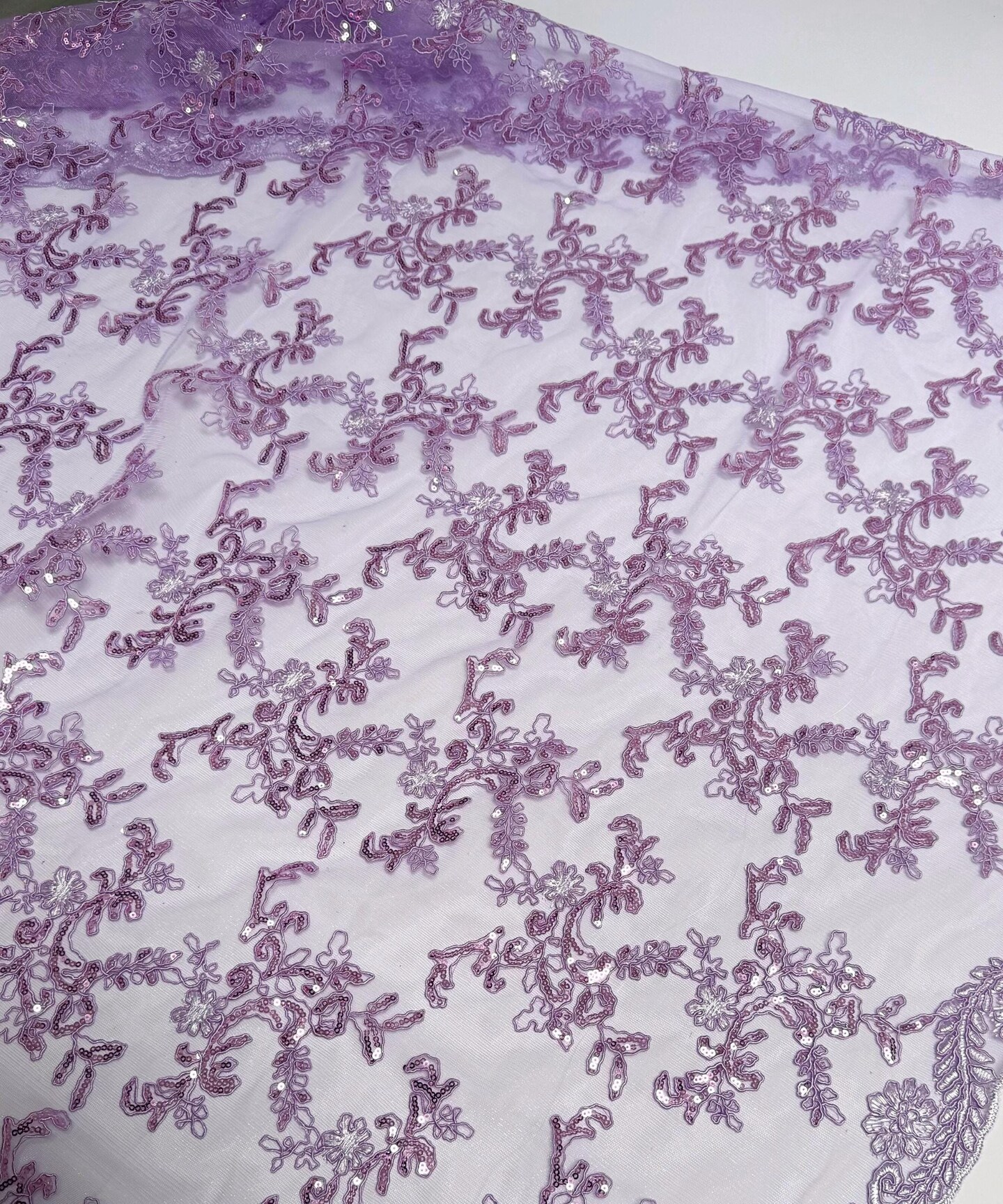 Lavender Sequin Embroidered Lace Fabric by the Yard, 54" Wide Floral Mesh Lace with Double Scalloped Edges