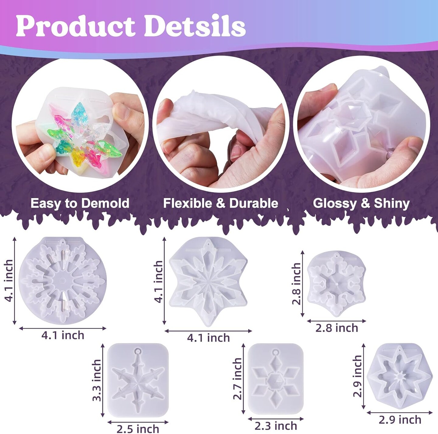 LET'S RESIN Christmas Snowflake Silicone Epoxy Molds, 6 Pcs Varying Sizes, 3D Crystal Resin Ornament Molds for Tree & Car Decoration, Keychain