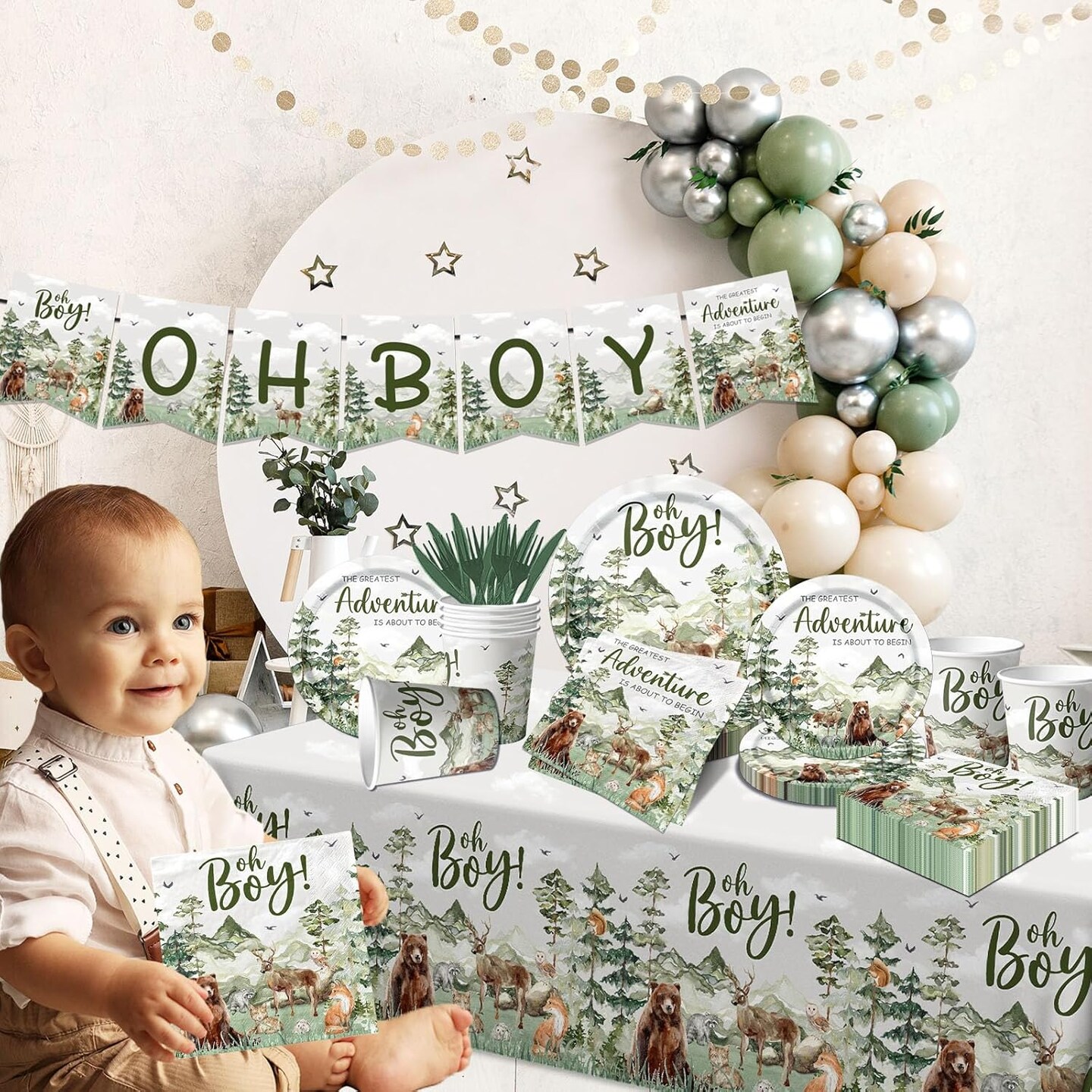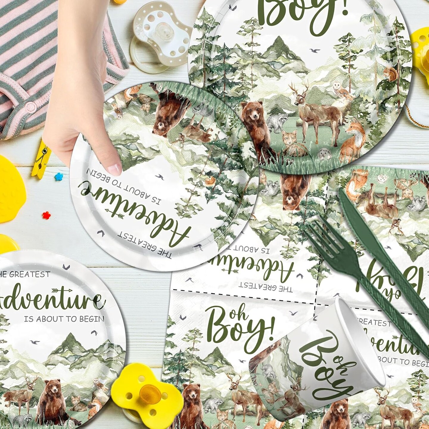 Let The Adventure Begin Baby Shower Tableware,Woodland Baby Shower (Green)