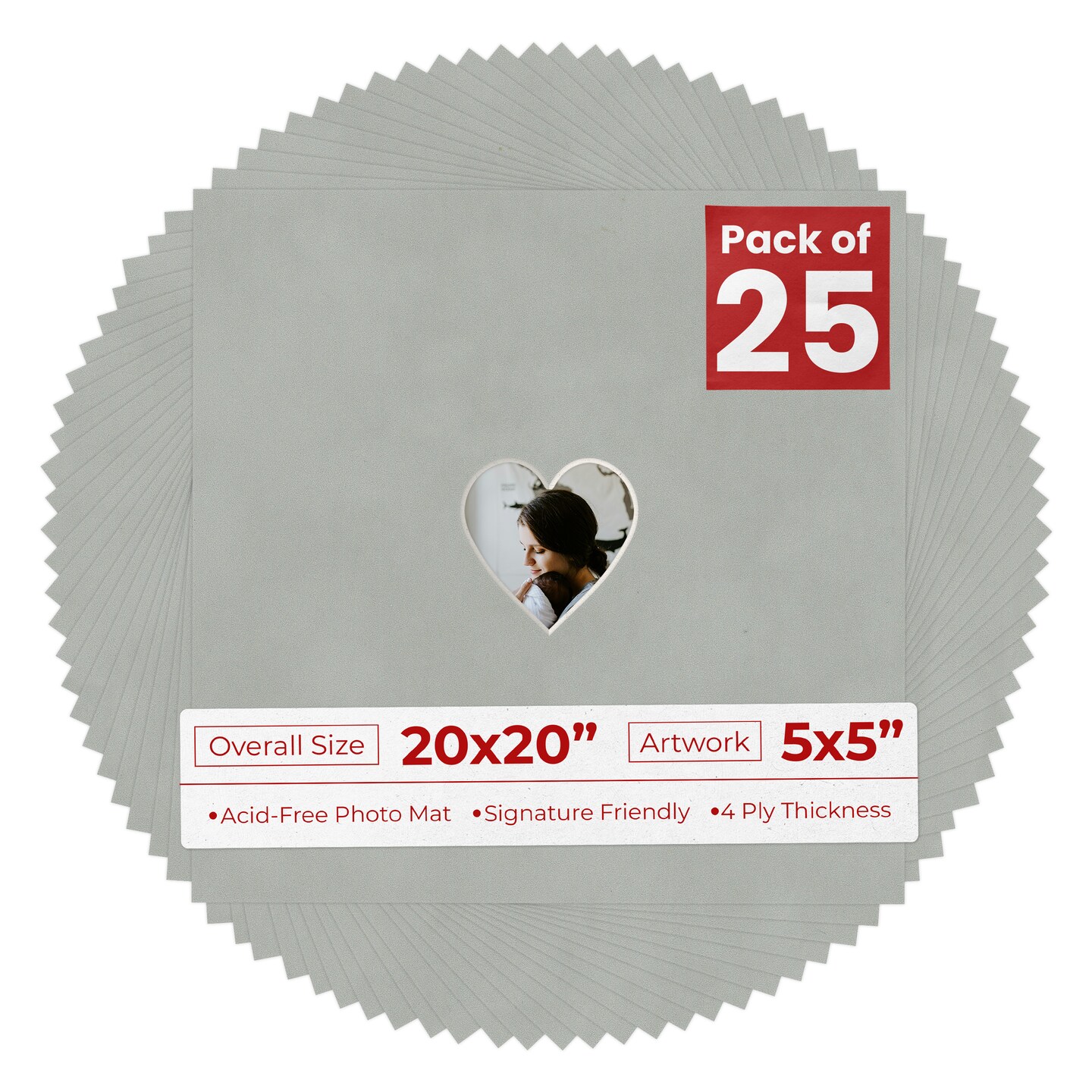 Light Grey Suede Mat Board for 20x20 Frames - Heart Opening for 5x5 Photos