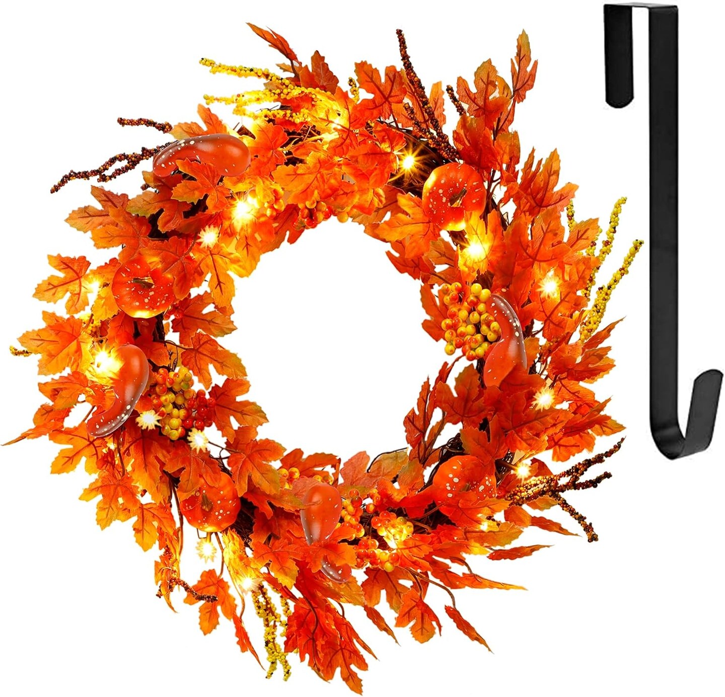 Lighted Fall Wreath with Metal Hanger, 16" Pre-lit Autumn Harvest Wreaths with 20 LED Lights