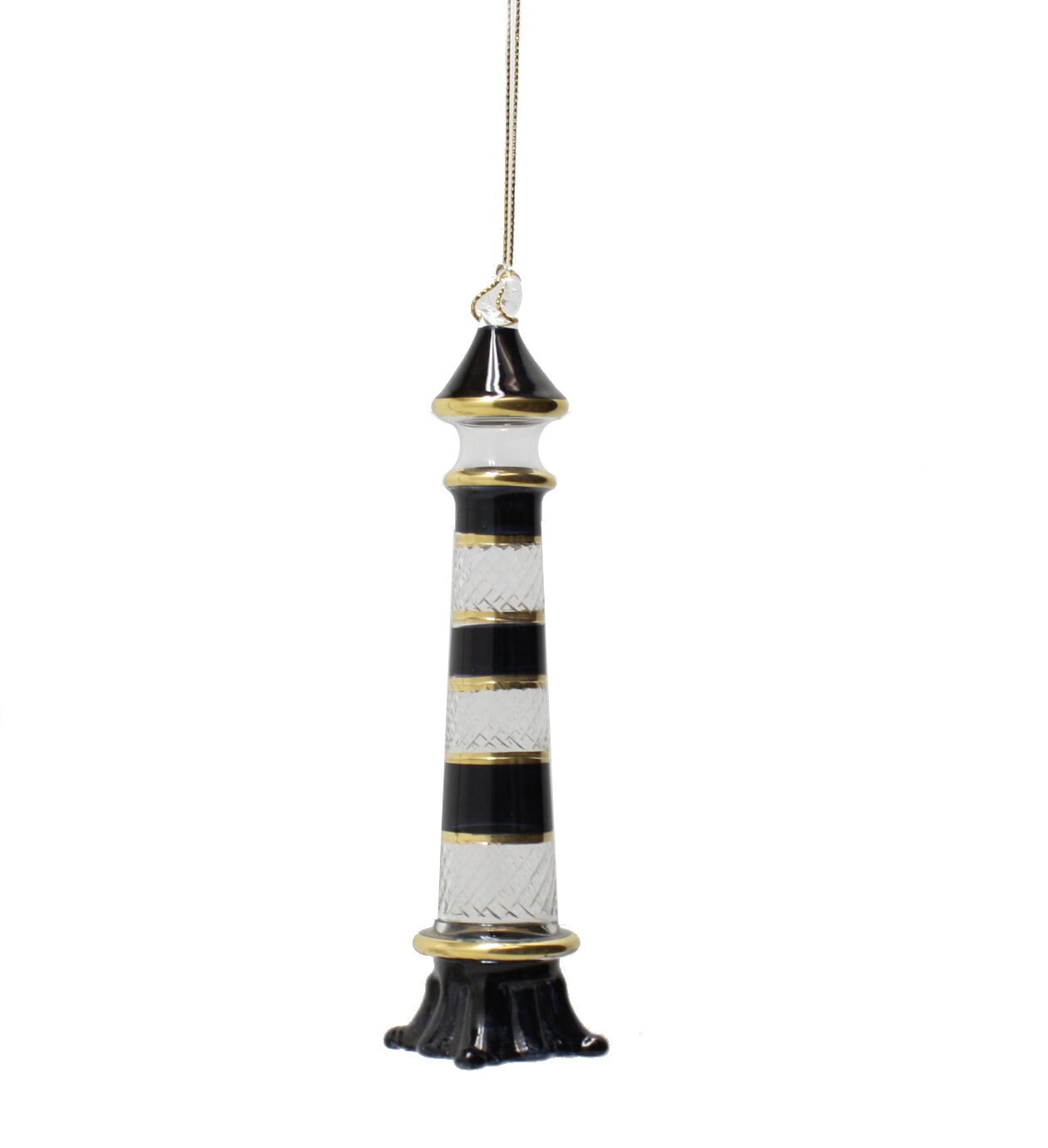 Lighthouse With Gold Rings and Etched Glass Ornament - Black